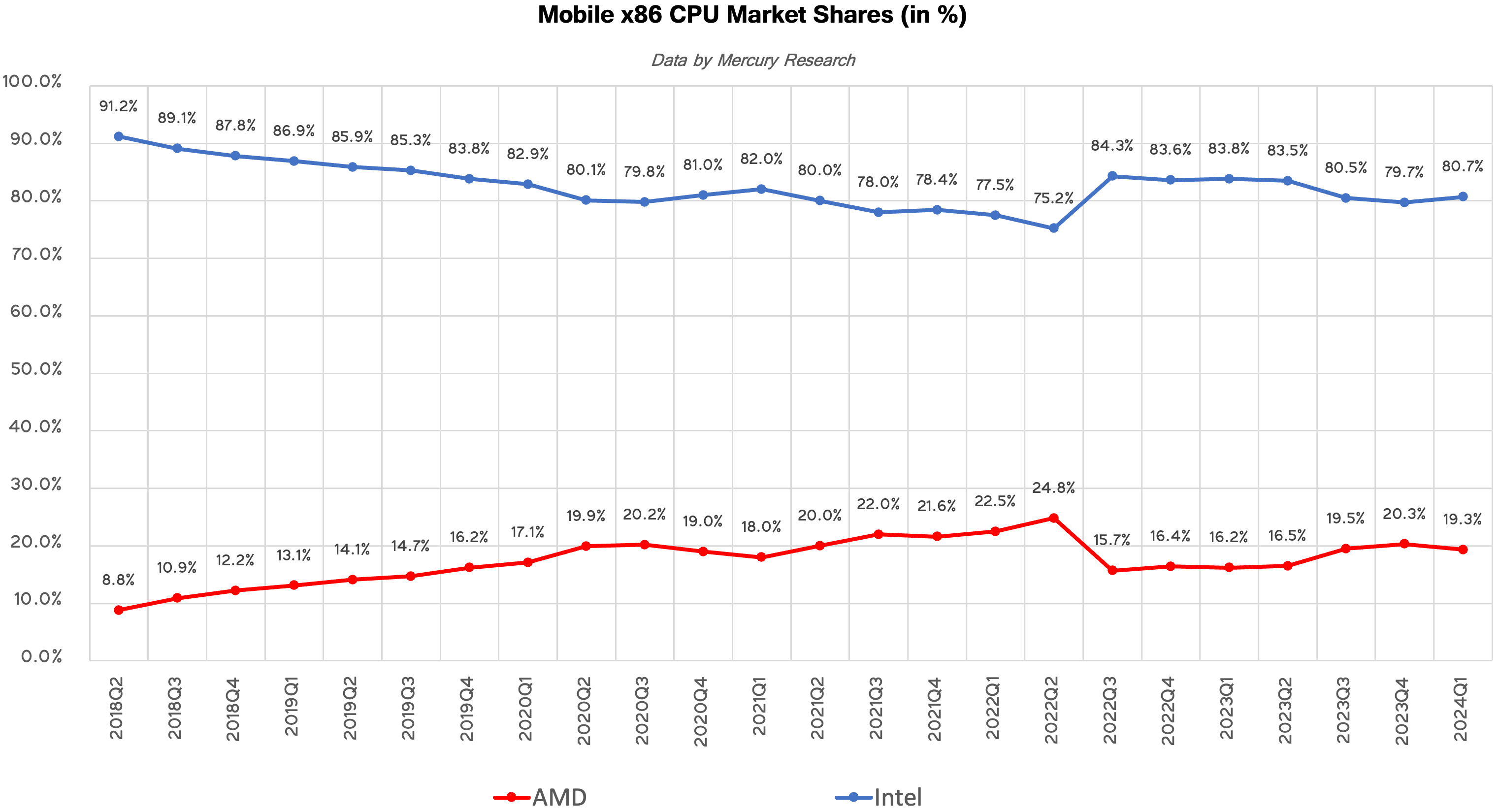 « Mercury a noté dans son rapport du premier trimestre que AMD a gagné une part de revenu significative dans les serveurs et les clients grâce à une demande croissante pour les processeurs EPYC de 4e génération et Ryzen 8000″, déclare le communiqué d’AMD.