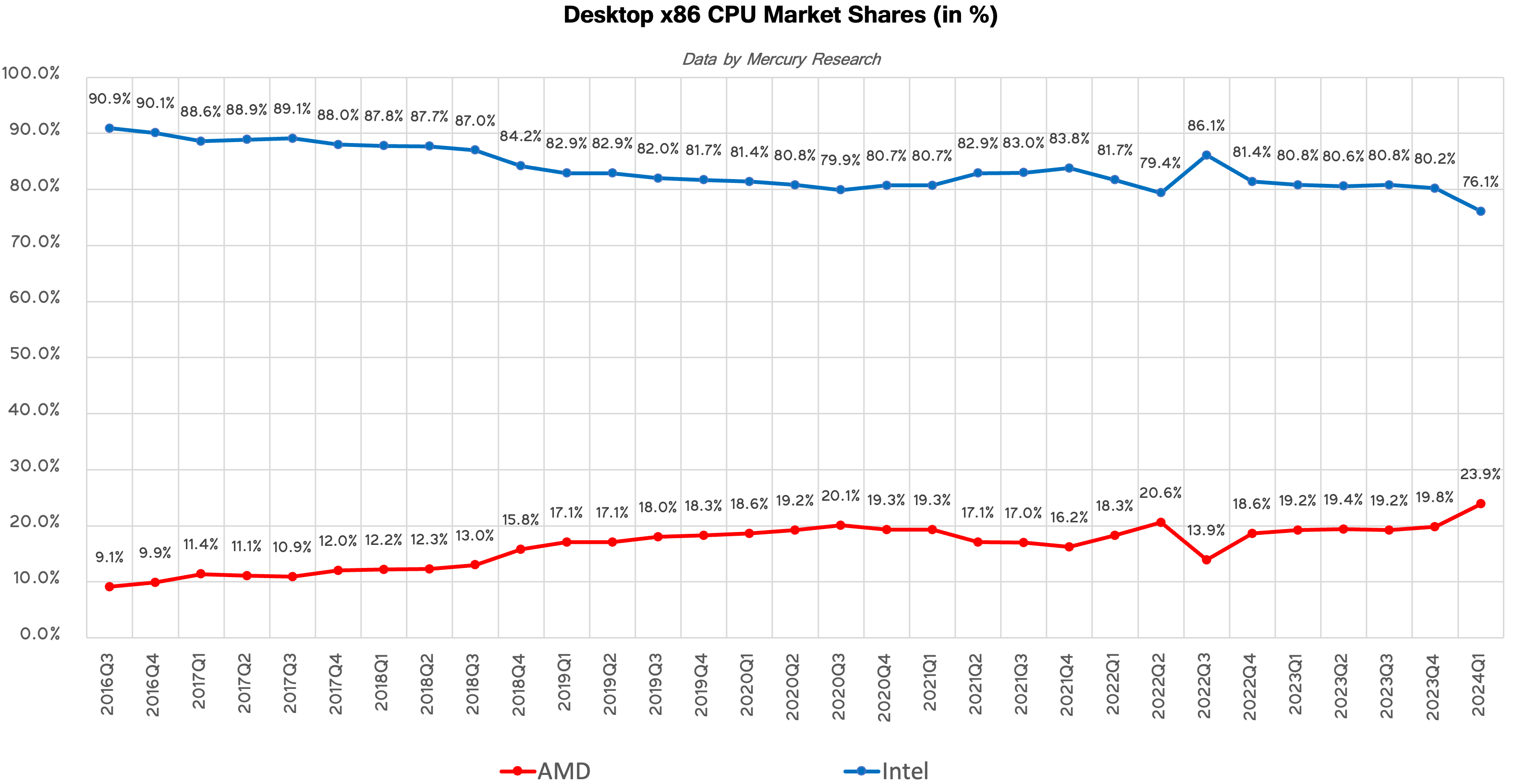 - La part de marché d’AMD dans les CPU de bureau a atteint son plus haut niveau en plus d’une décennie avec 23,9 % au T1 2024.
