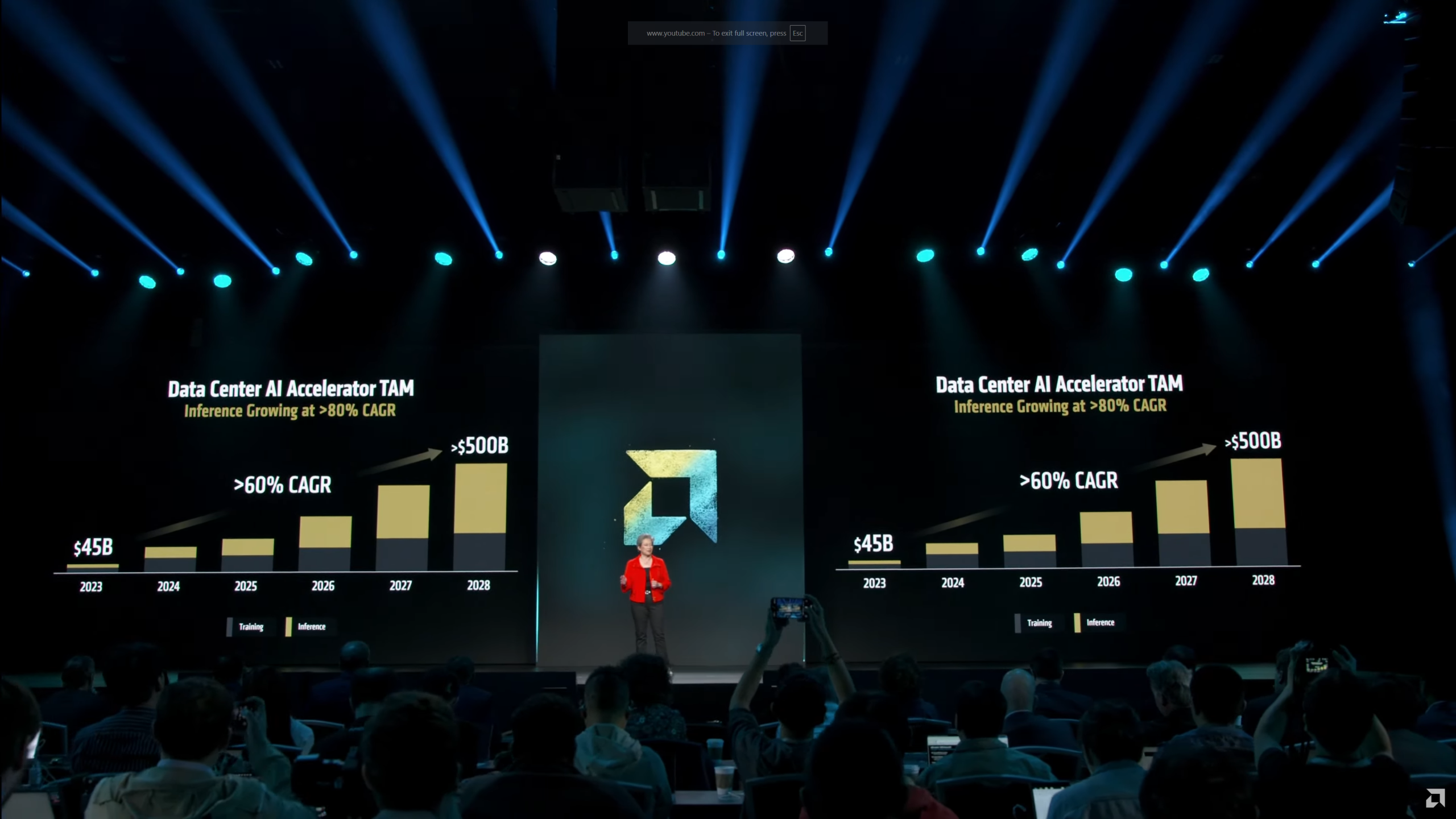 AMD met en avant une insuffisance de puissance de calcul pour traiter l’ensemble des nouveaux cas d’utilisation de l’IA. Selon la société, on peut s’attendre à ce que les revenus issus de l’IA et des centres de données continuent de progresser. Lors de la keynote Advancing AI, Lisa Su a annoncé que le marché des accélérateurs data centres croît à un impressionnant taux de 60 % par an, prédisant une valorisation de 500 milliards d’euros pour ce segment dynamique.