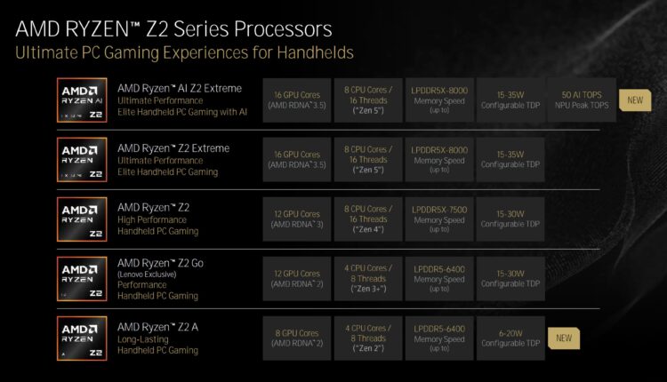 En plus du Ryzen AI Z2 Extreme, AMD a également annoncé le Ryzen Z2 A, destiné aux appareils de jeu portables d’entrée de gamme. Il comprend un CPU à 4 cœurs et 8 threads basé sur l’ancienne architecture Zen 2, huit cœurs graphiques RDNA 2, 6 Mo de cache et supporte la mémoire LPDDR5-6400. Son TDP configurable varie de 6 W à 20 W.