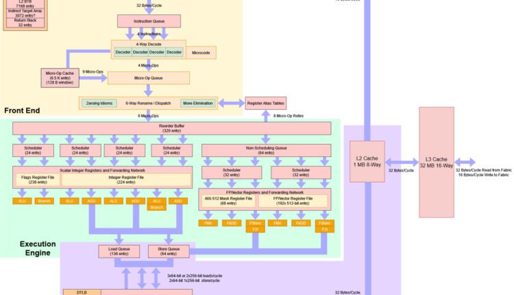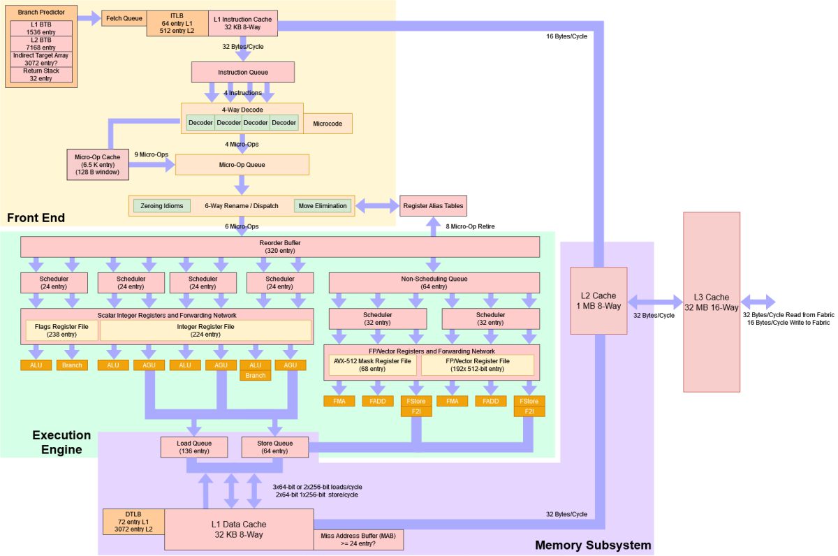 - Le jeu de registre pour les entiers est maintenant de 224 registres, tandis que le jeu de registres pour les nombres en virgule flottante et les vecteurs est maintenant de 192 registres. De plus, ce dernier est maintenant élargi à 512 bits pour prendre en charge les nouvelles AVX.