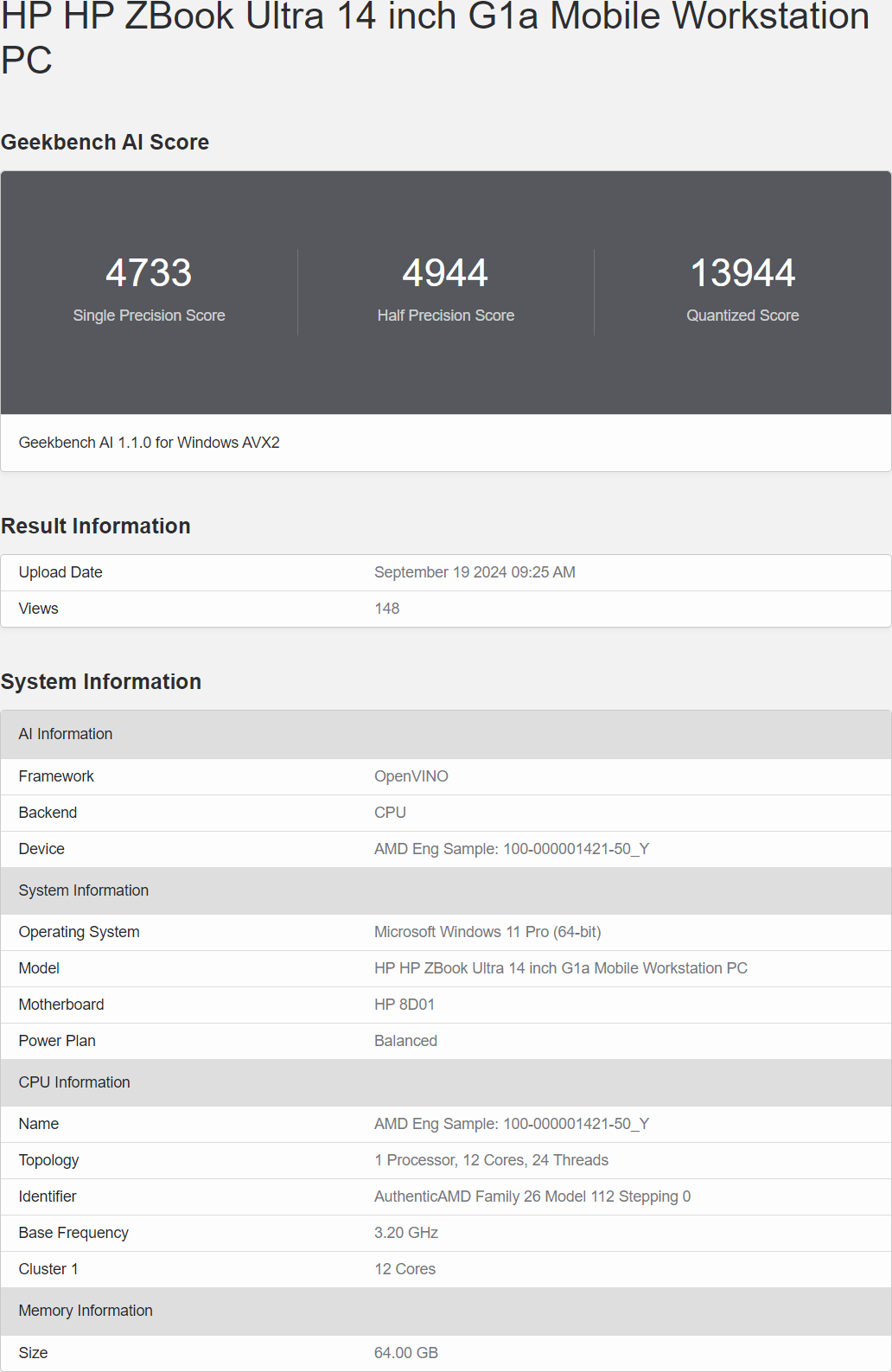 Les résultats des tests sur Geekbench montrent que l’appareil, un PC portable HP ZBook Ultra de 14 pouces, a obtenu des scores impressionnants : 4733 points en Single Precision, 4944 en Half Precision, et 13944 dans les tests quantifiés. Bien que ces chiffres soient encourageants, ils peuvent varier selon les configurations des appareils.