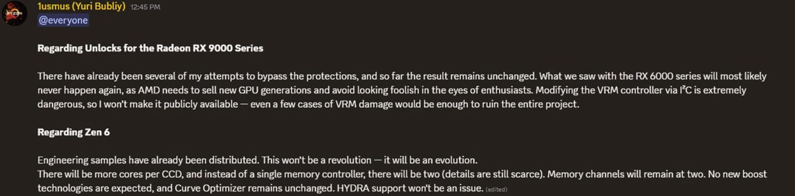 Yuri Bubily, créateur du logiciel de Tuning Hydra, a révélé sur son Discord officiel que les exemplaires d’ingénierie basés sur Zen 6 sont déjà entre les mains des partenaires constructeurs d’AMD. Selon Bubily, Zen 6 est mieux décrit comme une évolution de Zen 5, plutôt qu’un changement radical. La nouvelle architecture augmente le nombre de cœurs CPU par chiplet, atteignant jusqu’à 12 cœurs par CCD. Cela pourrait permettre aux processeurs de bureau d’atteindre jusqu’à 24 cœurs et 48 threads lorsqu’il y a deux CCD sur une seule puce, un bond significatif par rapport aux générations précédentes.