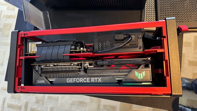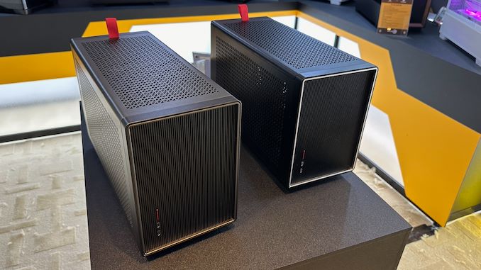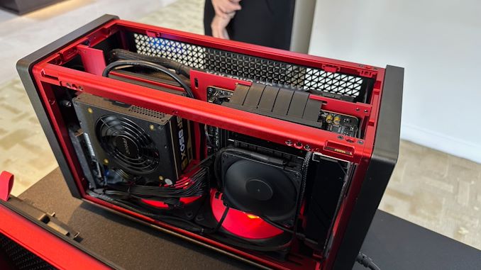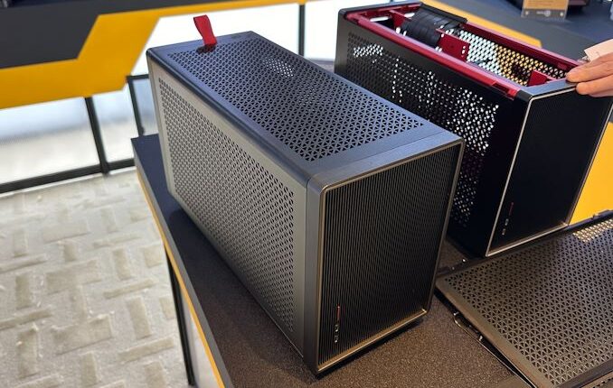 La Performance 1M d’Antec est un boitier Mini-ITX à double chambre qui sépare la carte vidéo du reste du système. La chambre principale abrite une carte mère Mini-ITX et une alimentation SFX, tandis que la chambre secondaire abrite une immense carte graphique. Notamment, les deux chambres sont reliées par un câble riser PCIe, permettant à la chambre de la carte mère d’être beaucoup plus courte qu’une carte PCIe de demi-hauteur, tandis que la chambre de la carte vidéo peut contenir une carte vidéo triple-slot parallèlement à la chambre de la carte mère, réduisant l’espace perdu. Pour la démonstration d’Antec au Computex, la société avait installé une carte ASUS GeForce RTX 4090 triple-slot pour montrer comment cela fonctionnait.