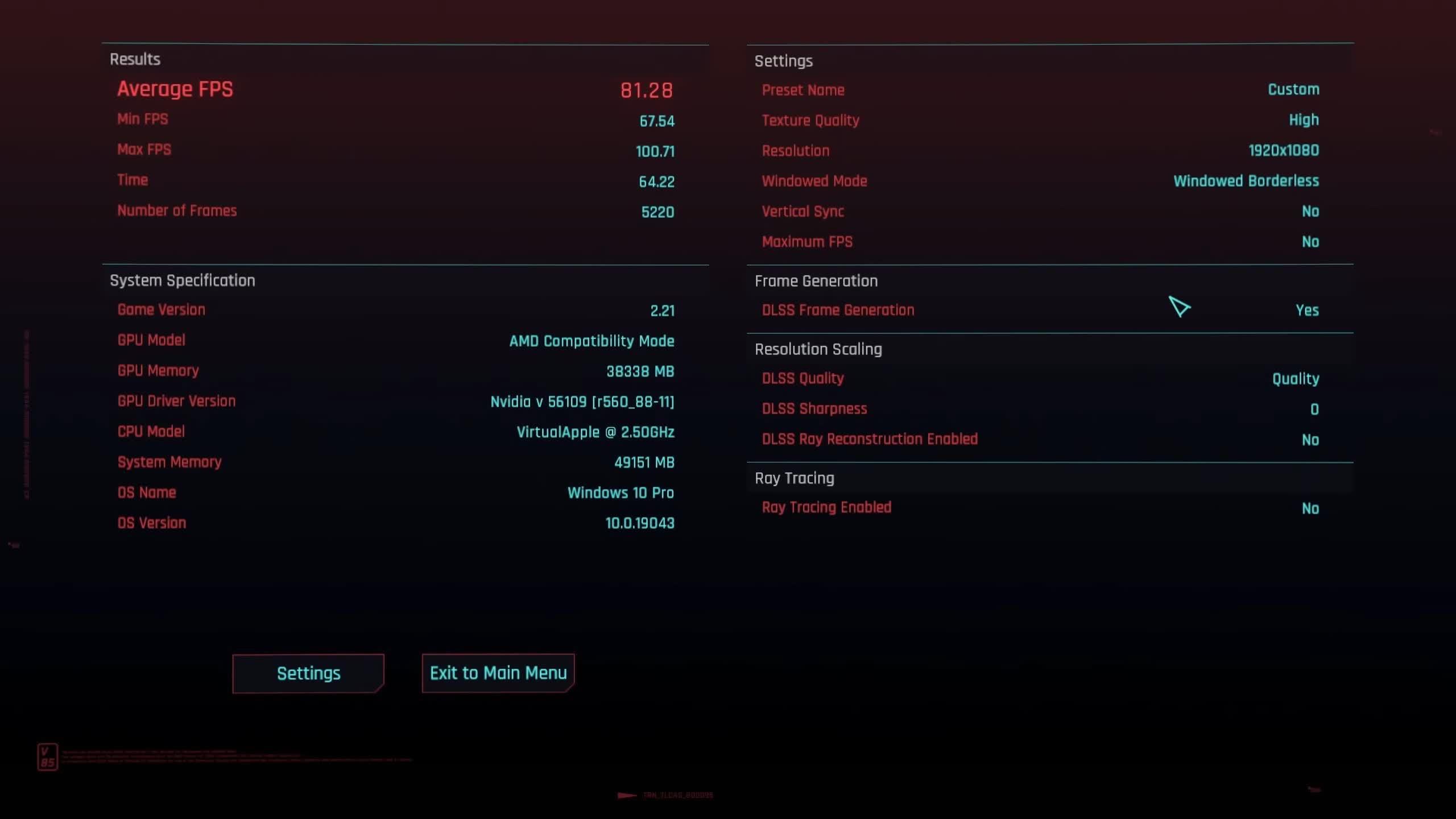 À 1080p avec mise à l’échelle et génération d’images activées, Cyberpunk 2077 a atteint environ 80 fps sur un MacBook Pro M3 Max.
