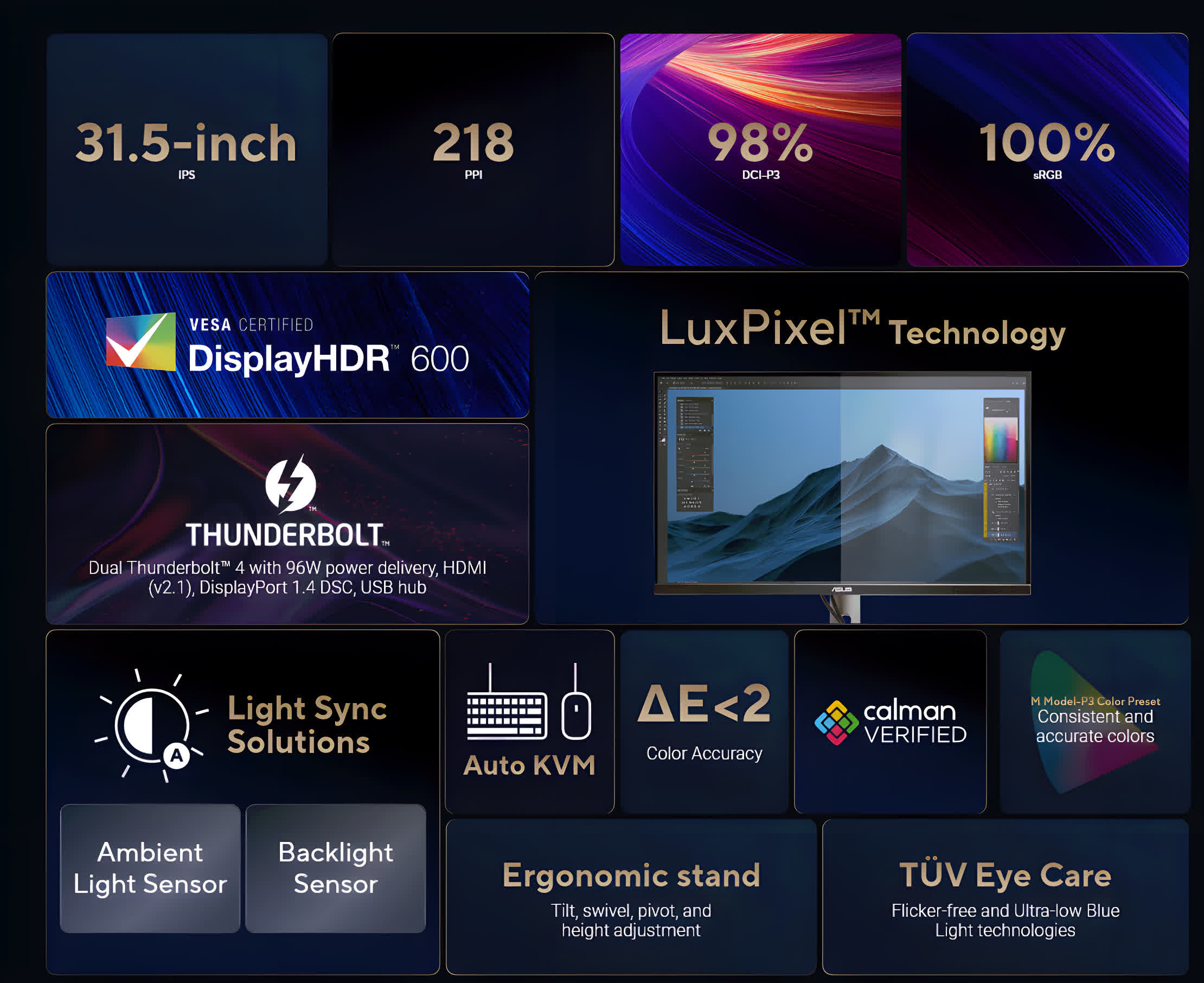 Le ProArt Display PA32QCV offre également une couverture de 98 % de l’espace colorimétrique DCI-P3 et de 100 % sRGB. Chaque écran est calibré individuellement en usine et vérifié par Calman. Il est également compatible HDR10 et VESA DisplayHDR 600.
