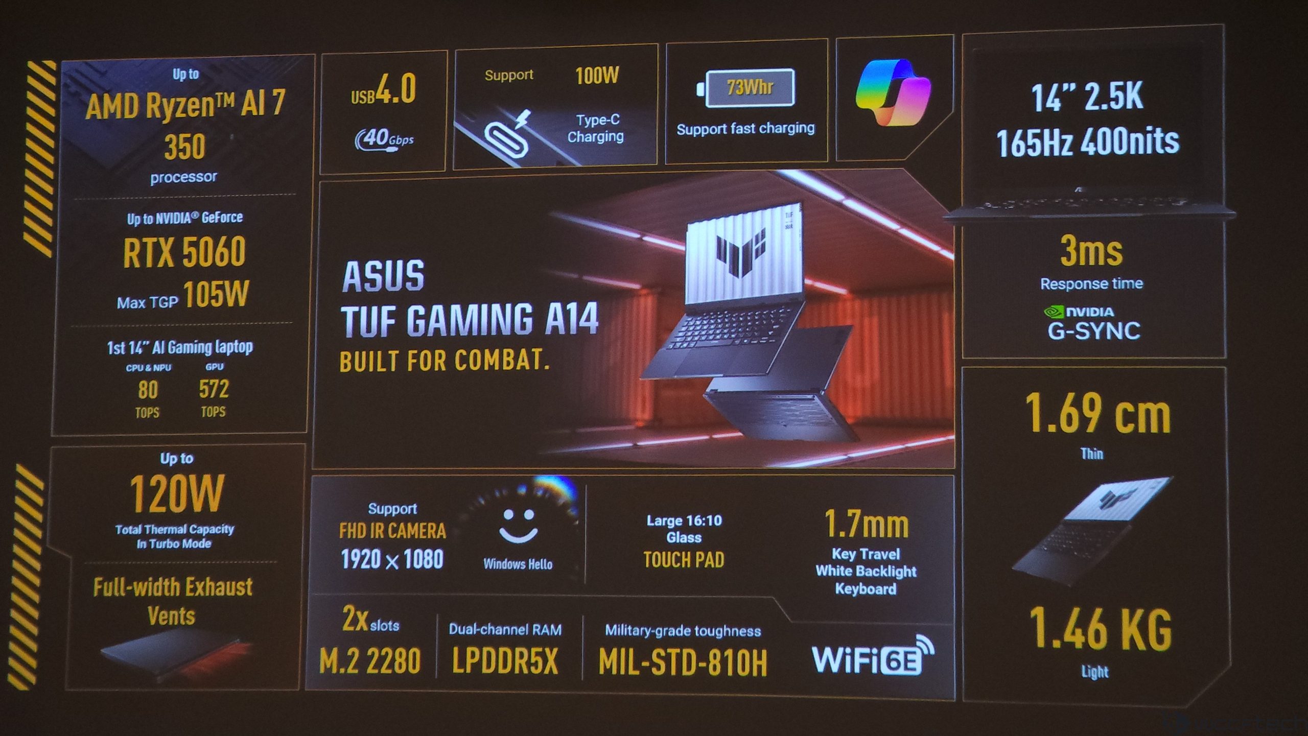 Pour le GPU mobile, le TUF A14 sera équipé de la NVIDIA GeForce RTX 5060, idéale pour les titres modernes en 1080p et 2K. Ce PC portables arbore un écran de 14 pouces avec une résolution 2.5K, un taux de rafraîchissement de 165 Hz et un temps de réponse de 3 ms, parfait pour les jeux et les tâches de productivité. ASUS a également innové avec un système de refroidissement basé sur le clavier, permettant de réduire les températures de 13 %.