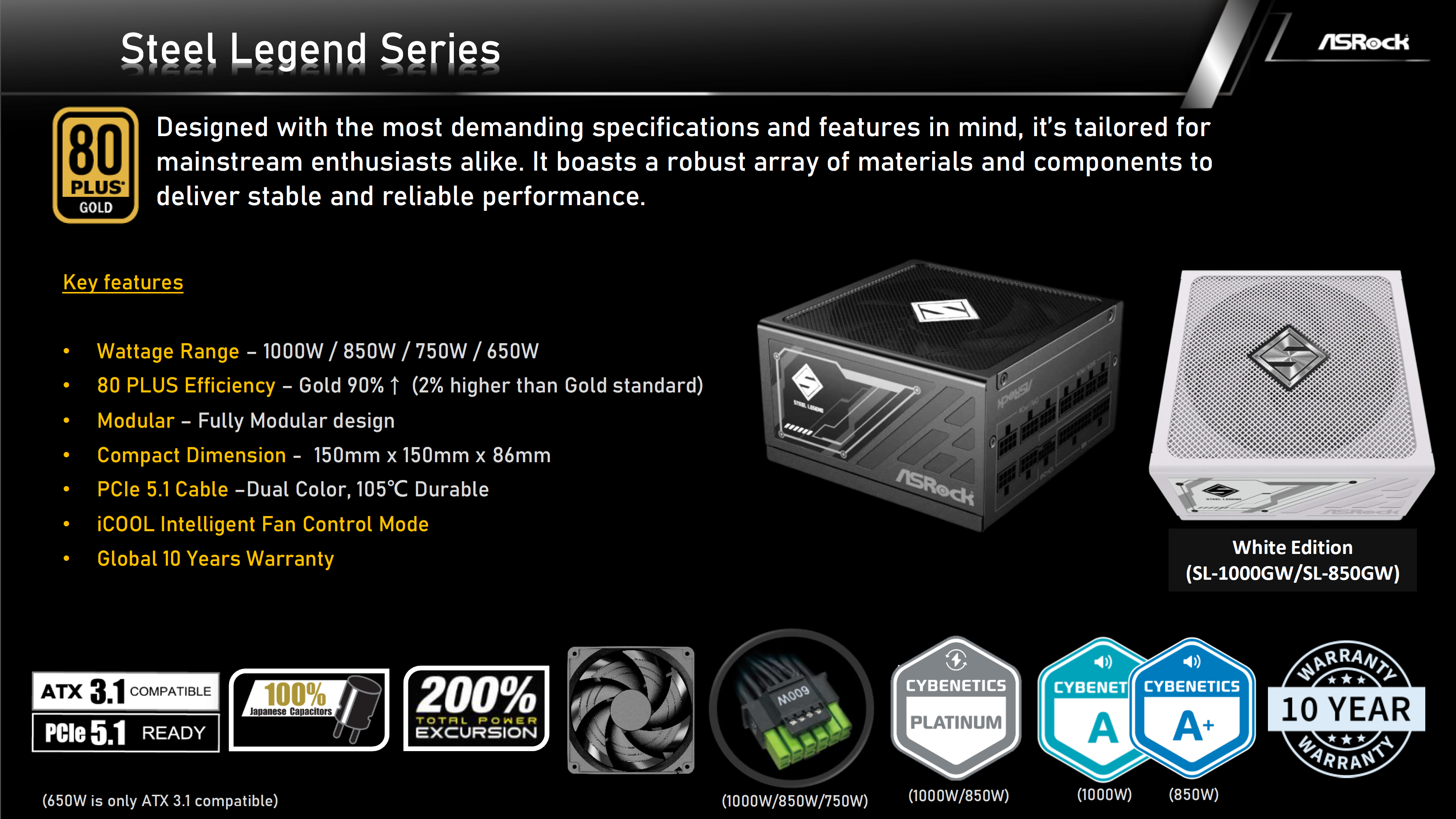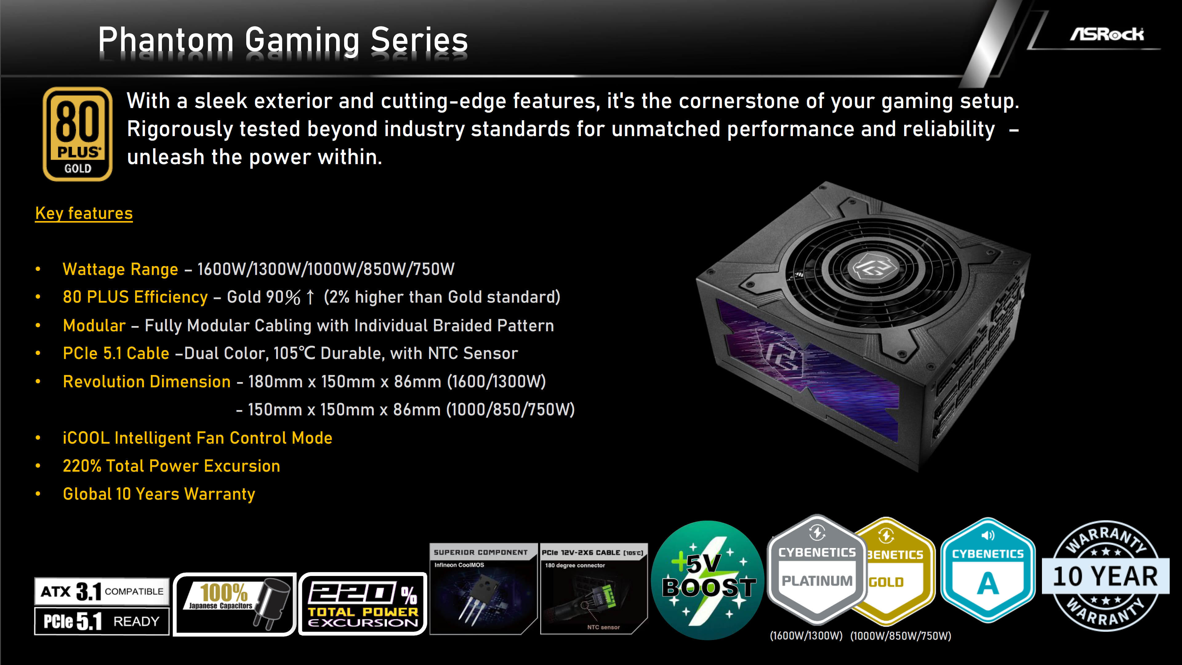 En devenant acteur sur le marché des PSU, ASRock propose un total de 17 nouveaux modèles, tous conformes aux normes ATX 3.1 et PCI-E 5.1. Ces alimentations sont conçues pour répondre aux exigences des cartes graphiques de nouvelle génération, assurant des charges de pointe allant jusqu’à 200-235%.