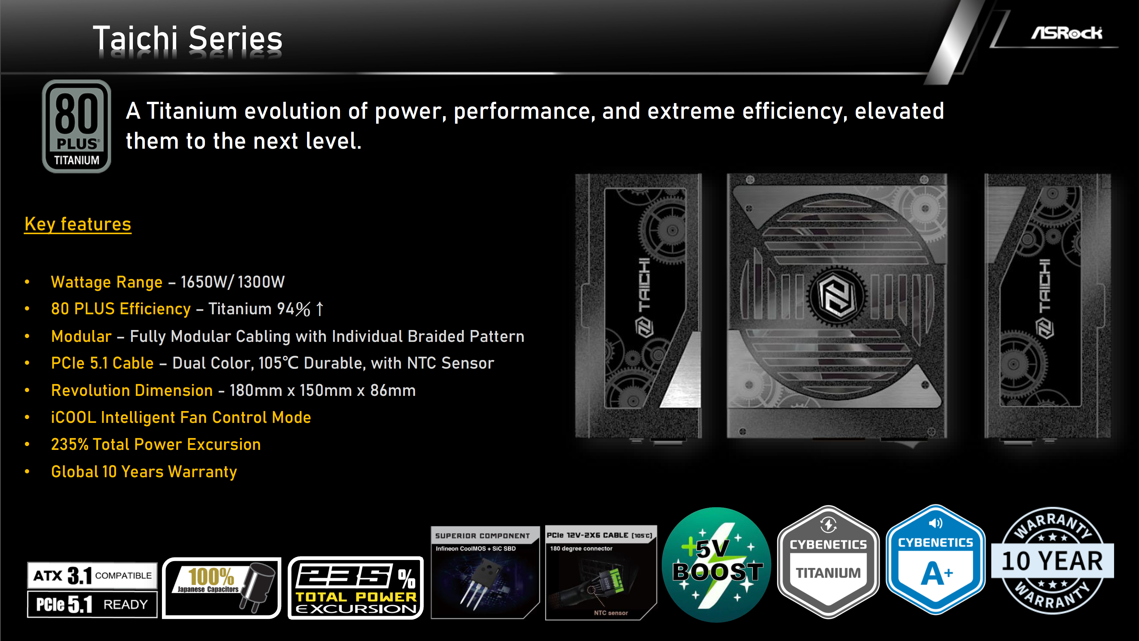 Les alimentations sont équipées de câbles 12V-2×6, permettant de délivrer jusqu’à 600W de puissance stable. La gamme est divisée en différentes sous-familles : Taichi, Phantom Gaming, Steel Legend et Challenger.