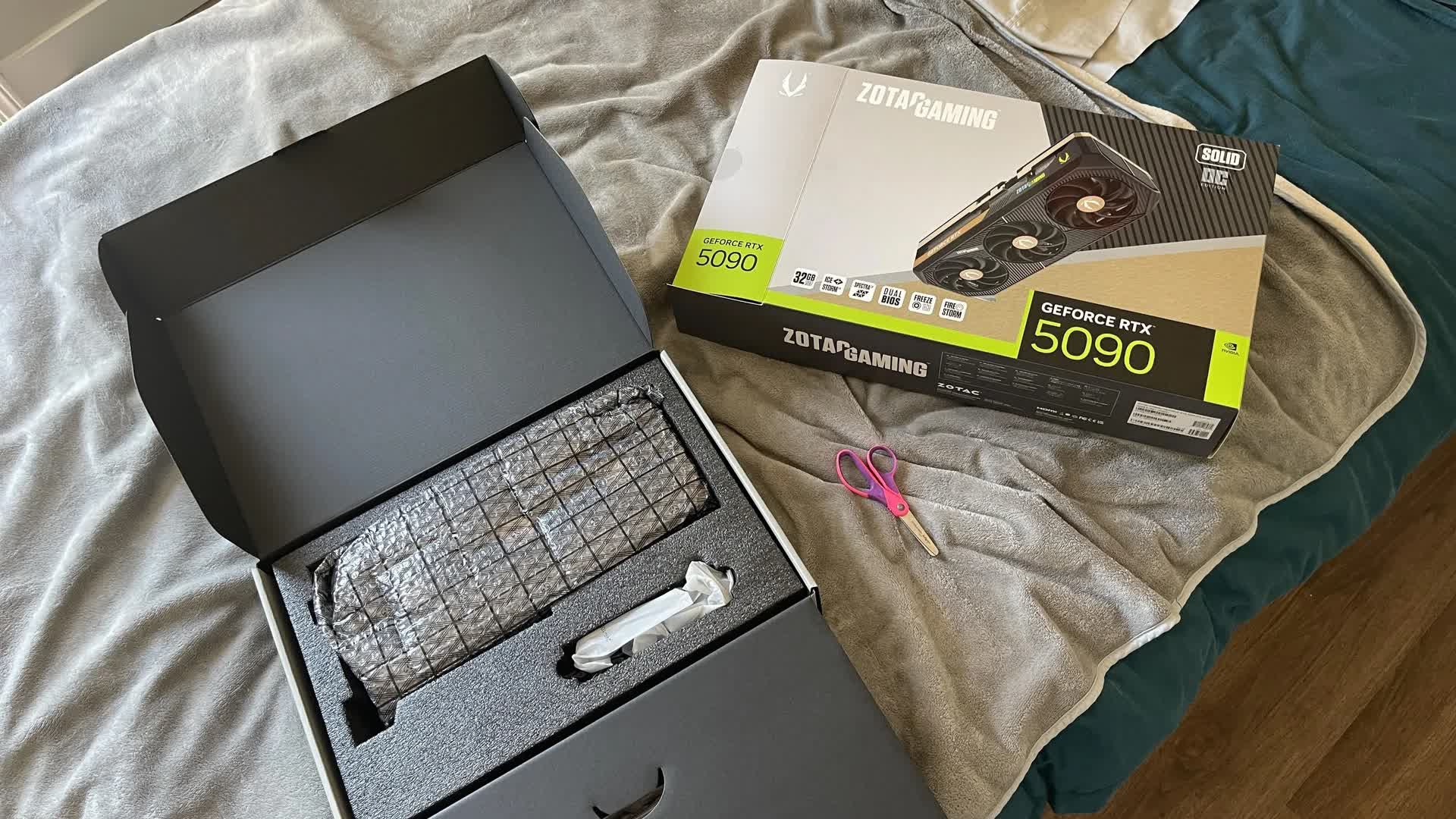 Un utilisateur Reddit, connu sous le nom de JamesFerg650, a posté une image – prise dans une voiture – de sa boîte Zotac RTX 5090 achetée chez Micro Center Santa Clara. D’autres images montraient la boîte ouverte sur un lit, ne contenant rien d’autre que des sacs GlamAholic scellés.