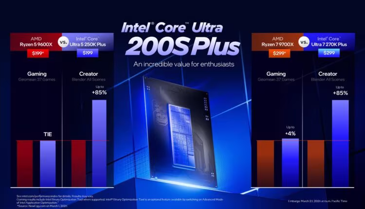Intel a récemment dévoilé des benchmarks officiels de ses processeurs Core Ultra 7 270K Plus et Core Ultra 5 250K Plus en matière de jeux, d’applications et plus, en les comparant aux CPUs AMD Ryzen.