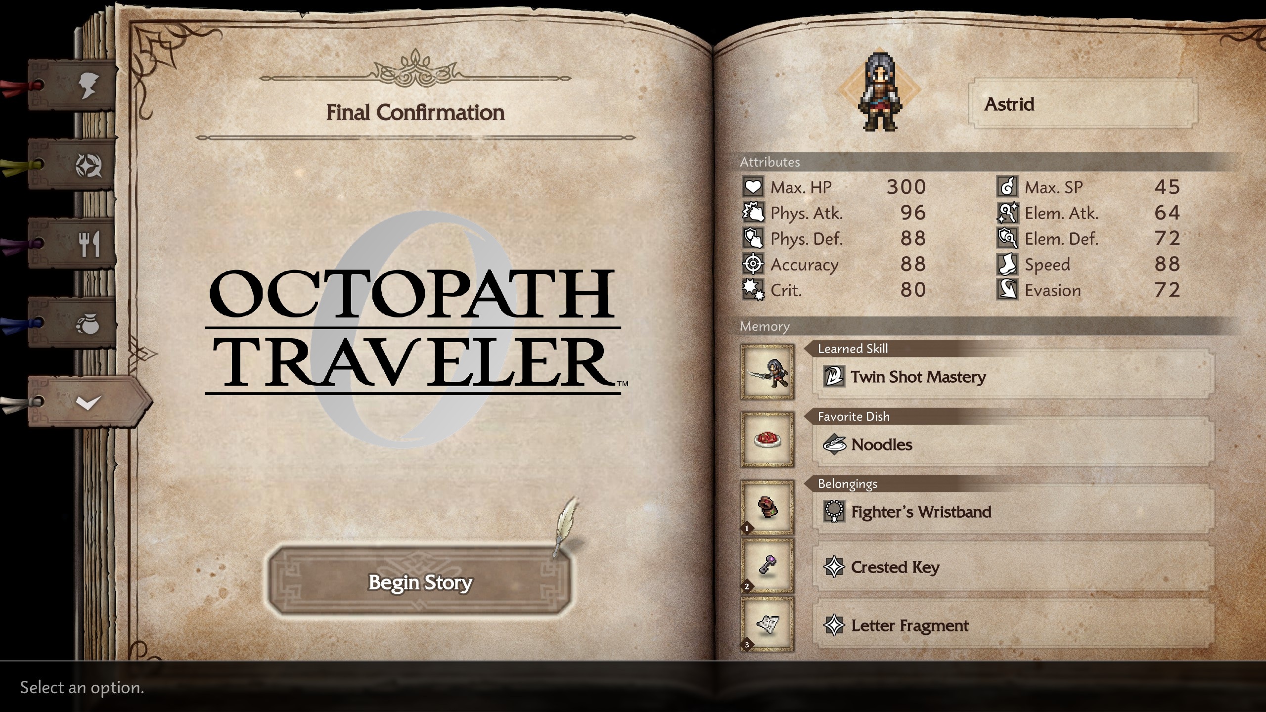 Octopath Traveler 0 représente une nouveauté dans la série avec un unique protagoniste personnalisable, contrairement aux huit personnages précédents. À l’initialisation du jeu, les joueurs détermineront l’apparence, les compétences, le plat préféré et trois objets de départ du protagoniste.