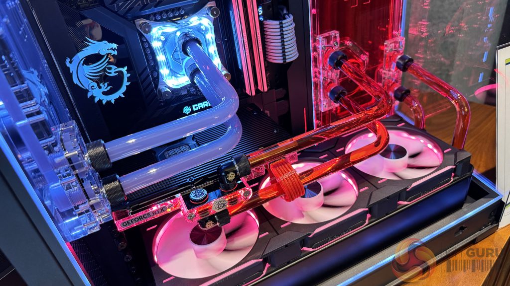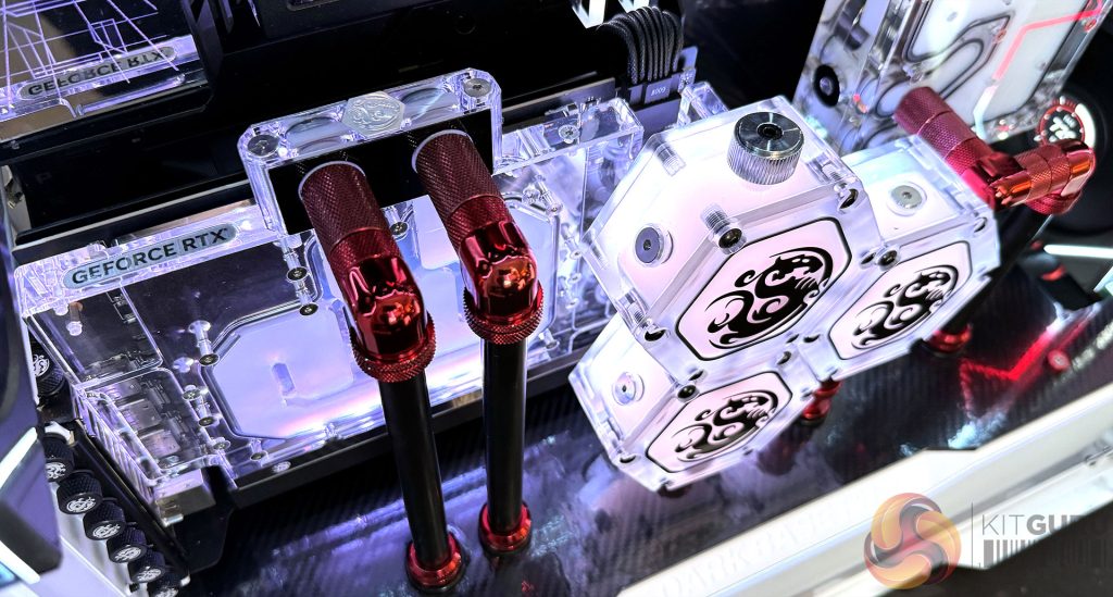 Les montages exposés par PC Werkx (Nebula Waterblock, radiateurs Leviathan II 360, réservoir CR240 et réservoir Hexagon 34) et Maingear (bloc d’eau Nebular, distribution personnalisée et blocs pour CPU) étaient remarquablement impressionnants.