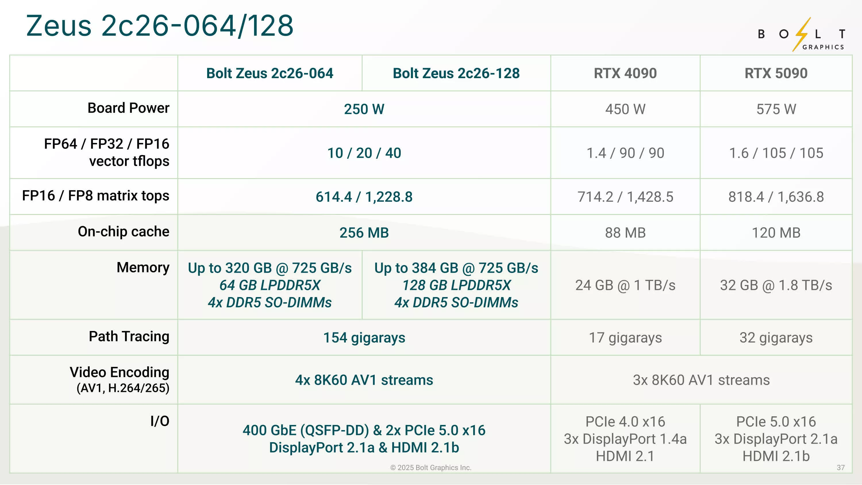 Par exemple, le modèle d’entrée de gamme « 1c-032 » serait capable d’atteindre 77 gigarays en rendu de chemin, contre 32 pour le RTX 5090. Il inclut aussi 128 Mo de cache, et Bolt essaie de relancer la VRAM socketable, permettant des configurations pouvant aller jusqu’à 160 Go de mémoire.