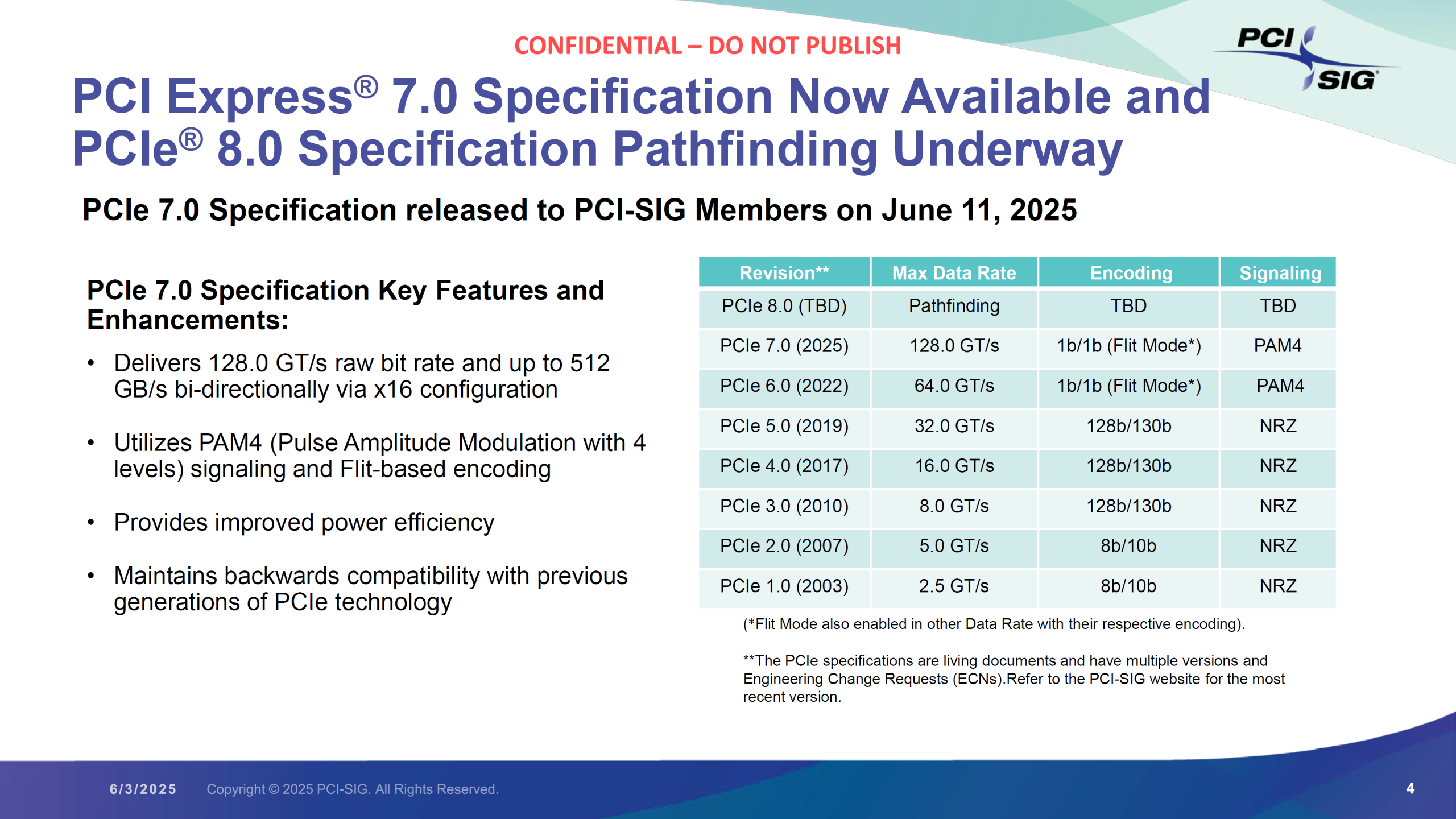 [Note de l’éditeur] En termes de bande passante, le PCIe 7.0 atteindra un débit allant jusqu’à 128.0 GT/s et une bande passante bi-directionnelle allant jusqu’à 512 Go/s via une configuration de 16 voies. Il utilise également la modulation d’amplitude d’impulsion (PAM4) et un codage basé sur des flots, permettant ainsi une meilleure efficacité énergétique tout en restant compatible avec les générations précédentes.