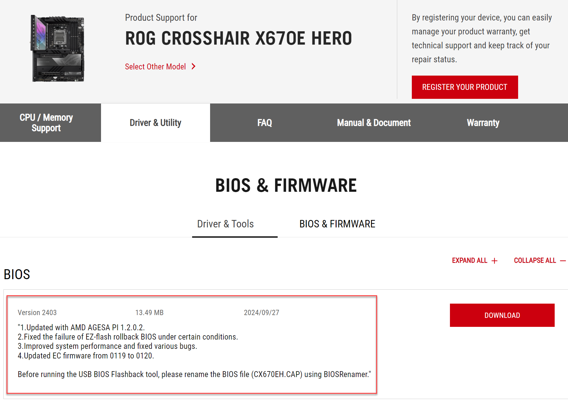 Les modèles confirmés ayant reçu la mise à jour BIOS 2403 comprennent l’ASUS ROG Crosshair X670E Hero, ainsi que toute la gamme ROG Strix X670E. Toutefois, plusieurs cartes ASUS X670E restent encore sous le BIOS beta.