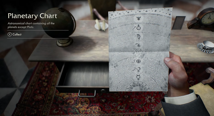 En vérifiant le bureau près du coffre-fort, vous tomberez sur une Carte Planétaire. Notez qu’un symbole y est absent. En examinant la base des statues, vous découvrirez que ce symbol est justement celui manquant sur la carte. Cette clé visuelle est essentielle pour avancer dans l’énigme.