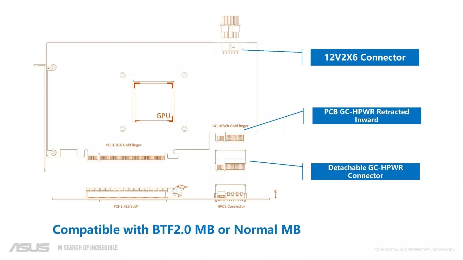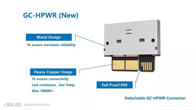 Auparavant, Asus avait démontré des cartes graphiques compatibles BTF qui remplaçaient les connecteurs d’alimentation conventionnels par un nouveau doigt en or GC-HPWR, positionné à côté du doigt en or PCIe x16. Les cartes mères compatibles BTF incluent un connecteur HPCE correspondant, offrant aux constructeurs de PC personnalisés un câble de moins à gérer.