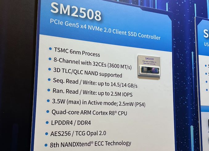 Sous le capot, l’interface avant du contrôleur SSD SM2508 est basée sur quatre cœurs Arm Cortex-R8, ce qui en fera un contrôleur notablement puissant (l’E26 de Phison, pour référence, est basé sur deux cœurs Arm Cortex R5 avec un accélérateur). Ce contrôleur est également conçu pour être utilisé avec de la DRAM et prend en charge à la fois le DDR4 et le LPDDR4.