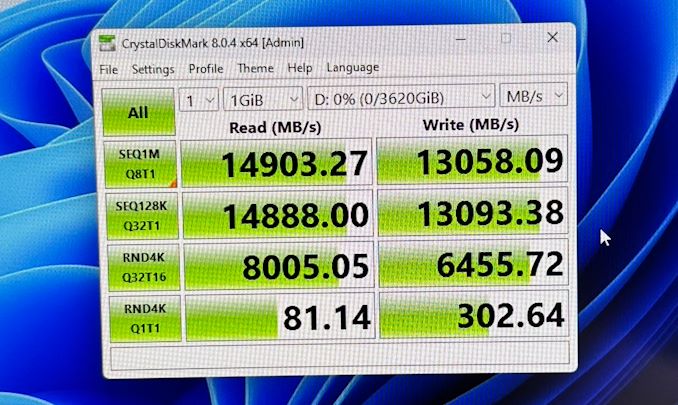 L’arrière de la puce offre huit canaux NAND avec 32 cibles de sélection d’adresse, prenant en charge des vitesses d’interface allant jusqu’à 3600 MT/s. Dans l’ensemble, SMI affirme que le contrôleur peut atteindre des vitesses de lecture séquentielle allant jusqu’à 14.5 Go/s et des vitesses d’écriture allant jusqu’à 14 Go/s, tandis que les performances de lecture et d’écriture aléatoires 4K atteindront jusqu’à 2.5 millions d’IOPS. Et le lecteur de démonstration de SMI au Computex s’est encore mieux comporté, atteignant une vitesse de lecture de 14.9 Go/s sous CrystalDiskMark.