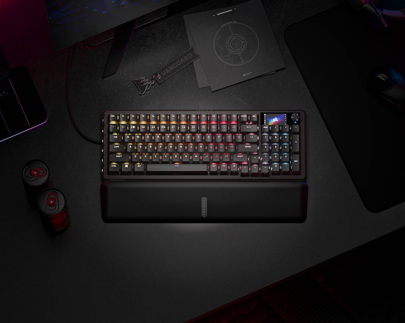 Les claviers Vanguard 96 se présentent sous un format de 96%, intégrant le pavé numérique et les touches de fonction tout en les rendant plus compacts. L’objectif est de fournir un clavier à taille réduite tout en conservant toutes les fonctionnalités d’un modèle standard. L’intégration native d’Elgato Stream Deck permet d’accéder à des raccourcis via l’application Stream Deck, complétée par un écran LCD couleur de 320×170 qui affiche diverses informations ou même des GIF amusants.