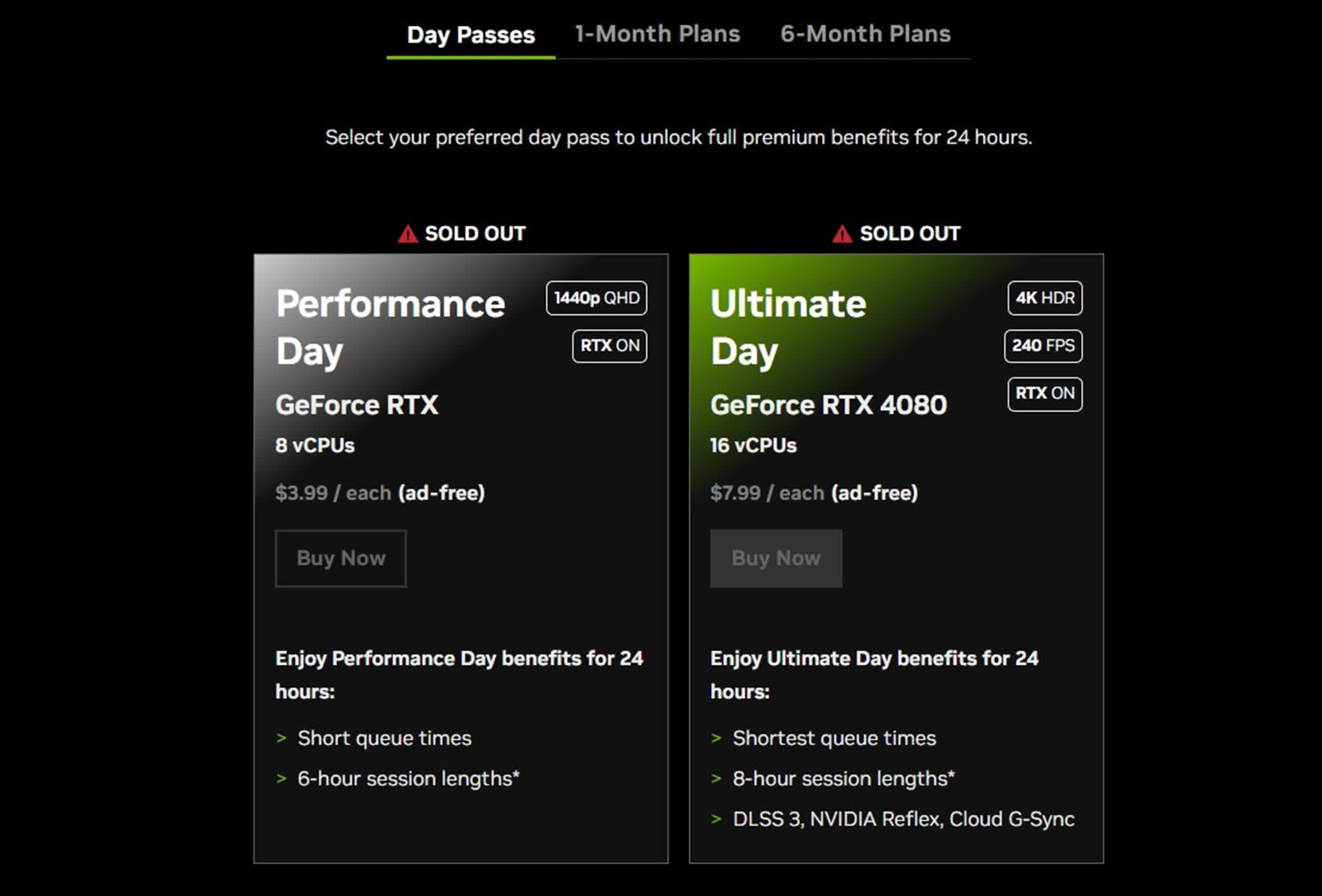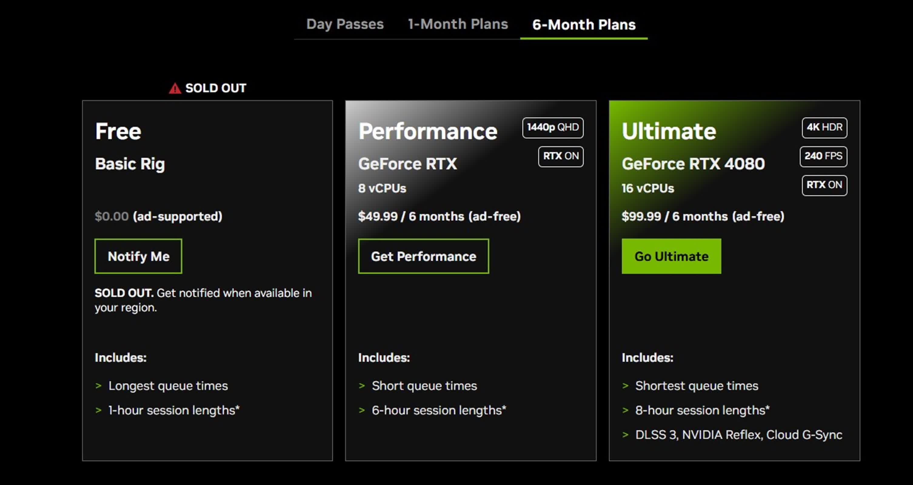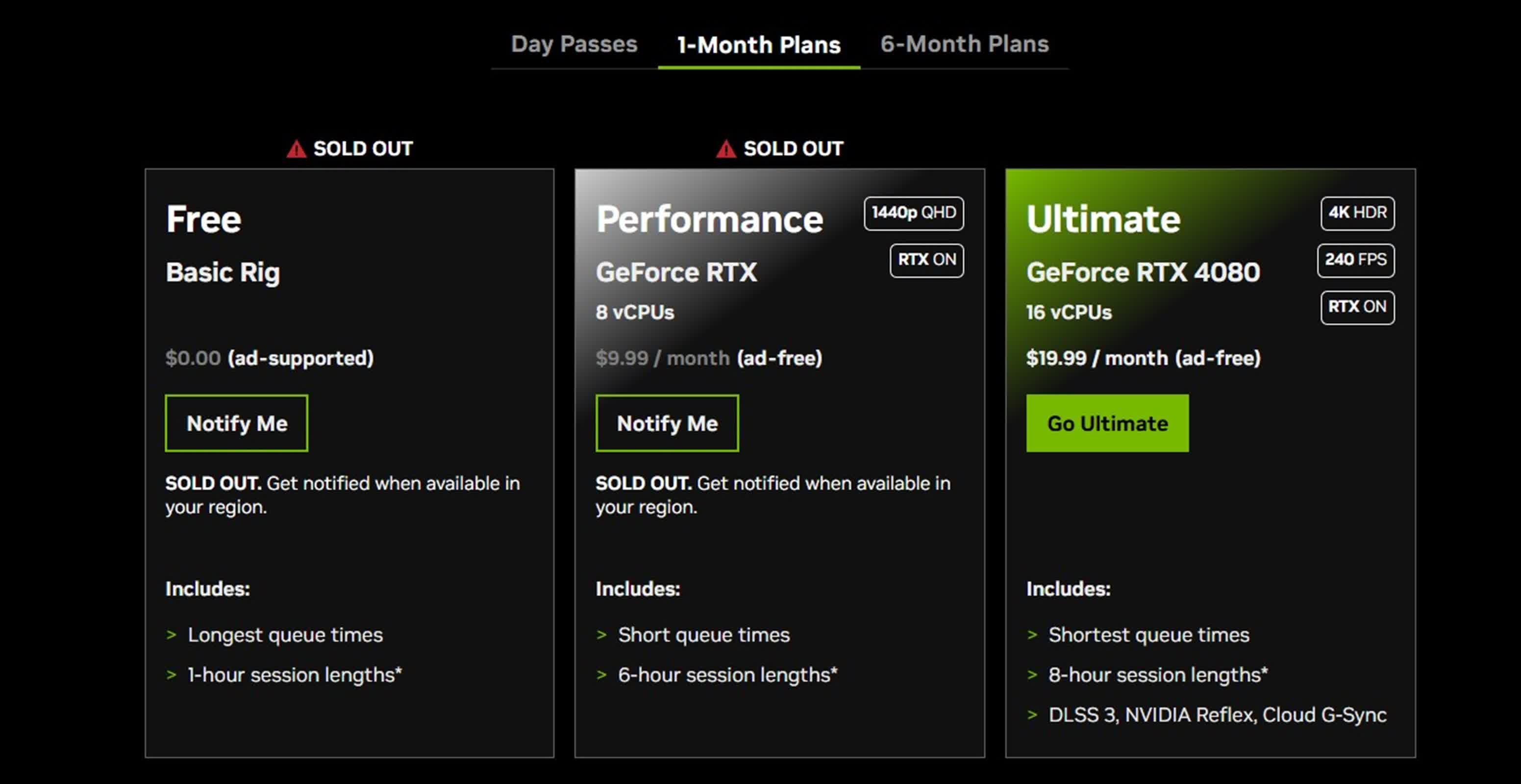 Actuellement, cinq des huit niveaux d’abonnement pour GeForce Now ne sont pas disponibles, y compris tous les Pass Journaliers, les niveaux gratuits et de performance du plan d’un mois, ainsi que le niveau gratuit du plan de six mois.