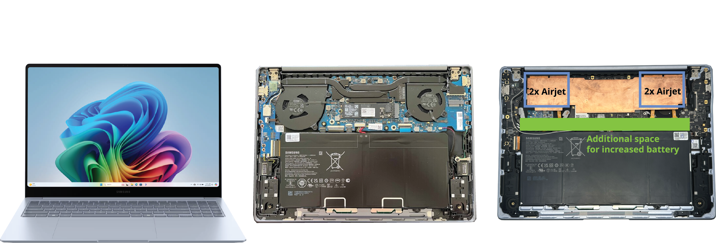 L’intégration des puces AirJet crée également un espace supplémentaire à l’intérieur du Galaxy Book4 Edge. Cela pourrait permettre d’augmenter la capacité de la batterie de 55,9 Wh à 64,8 Wh, correspondant à une augmentation de 16%. Cette amélioration se traduit par un temps d’exécution vidéo prolongé, passant de 20 heures à 23,2 heures.