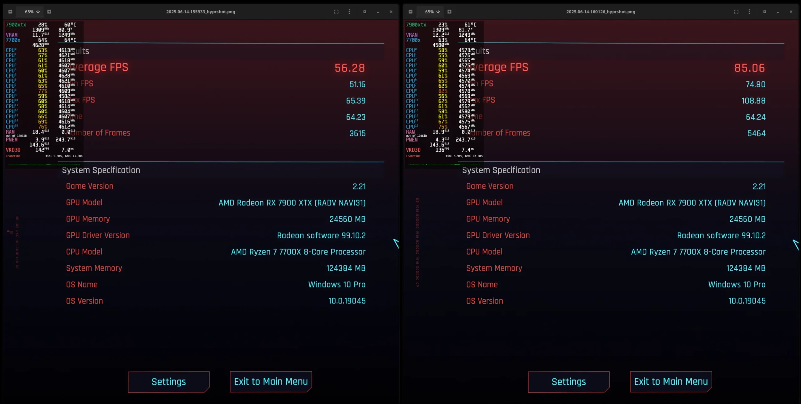 Pour Cyberpunk 2077, en 4K, l’utilisateur a enregistré une moyenne de 56.28 FPS avec FSR 4 activé, contre 85.06 FPS avec FSR 3.1. Le préréglage de qualité a été utilisé dans les deux cas, et il est clair que FSR 4 génère une image de meilleure qualité que l’implémentation du FSR 3.1.