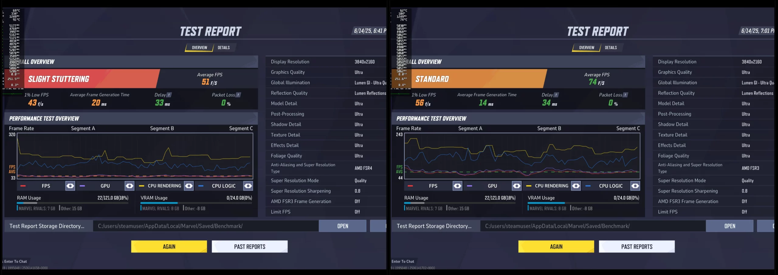 Enfin, une comparaison du FSR 4 avec FSR 3.1 dans Marvel’s Rivals révèle que le FPS moyen chute à 41 avec FSR 4, contre 74 avec FSR 3.1. Bien que l’implémentation du FSR 3.1 soit plus performante ici, FSR 4 améliore certains aspects du jeu. Cependant, la perte de FPS ne semble pas justifiée pour ce titre rapide d’eSports.