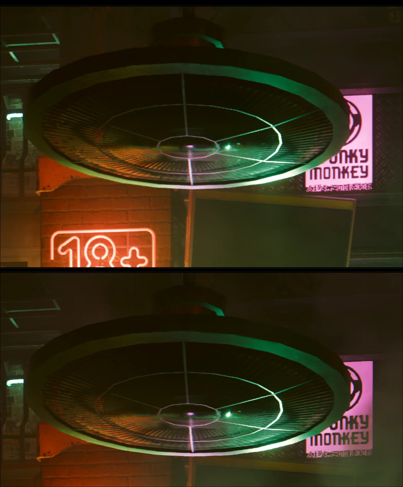 Qualité FSR 4 (en bas) vs FSR 3.1 (en haut) dans Cyberpunk 2077