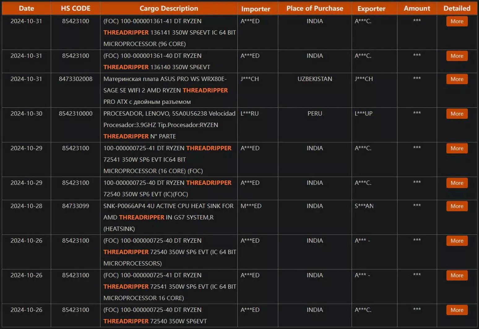 La fuite provient du divulgueur @Olrak29_, qui a aperçu deux CPU Threadripper 9000 listés dans un journal d’expédition sur NBD.ltd. L’un des CPU est un modèle à 96 cœurs, probablement le modèle phare de la gamme Shimada Peak, tandis que l’autre est une puce à 16 cœurs, qui pourrait servir d’option d’entrée de gamme pour les Threadripper basés sur Zen 5. La liste confirme également que les deux puces utiliseront le socket SP6 et auront une TDP maximale de 350W.