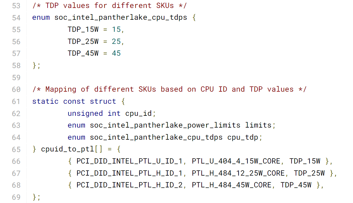 | Configuration Panther Lake | Segment CPU | PL1 W (Performance) | PL2 W (Extreme Performance) | PL3 W (Performance) | PL4 W (Performance) | IA Iccmax (A) (Performance) |