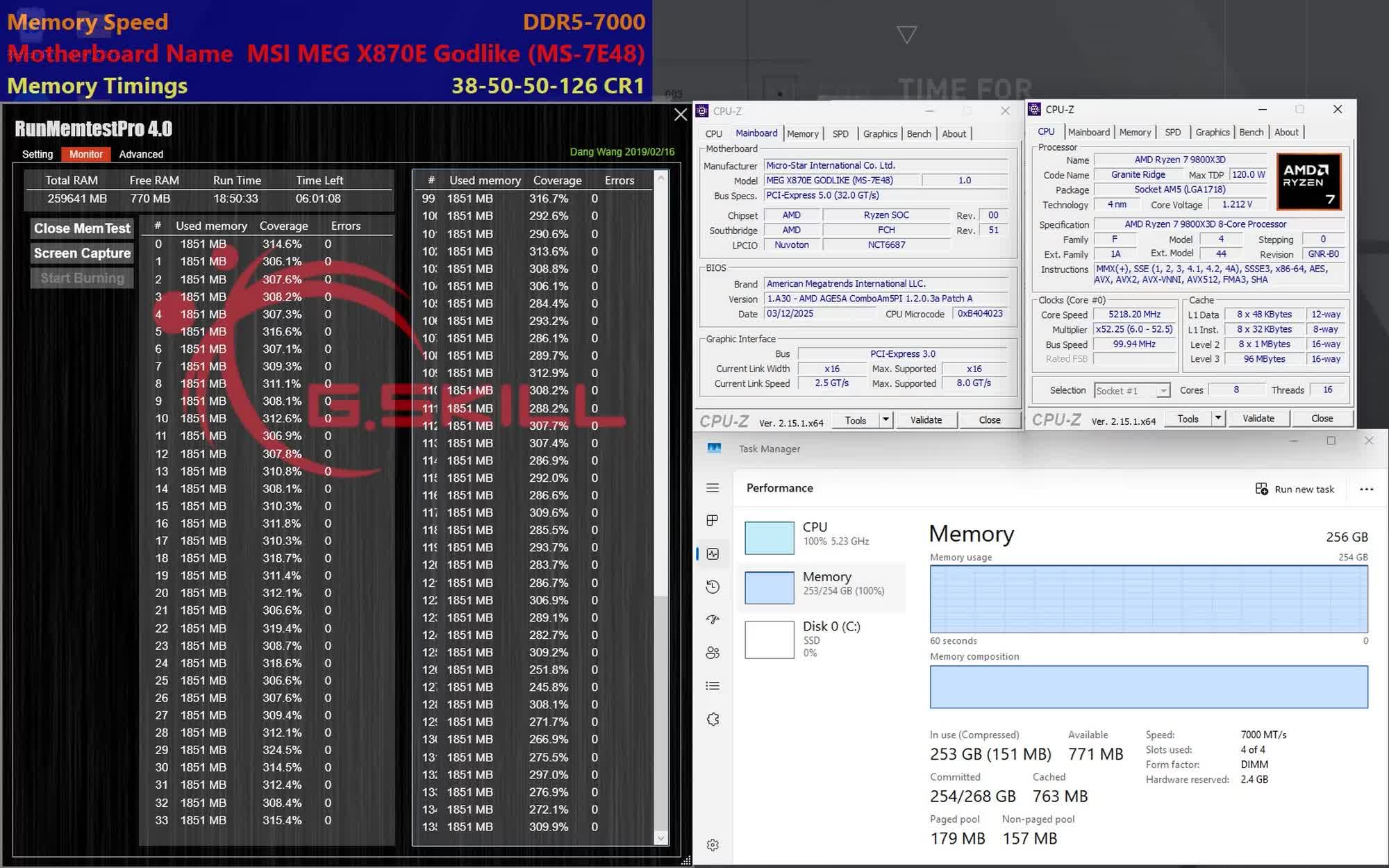 Les captures d’écran de tests de stress publiées par G.Skill semblent valider les vitesses, les timings et la stabilité revendiqués du kit. Les tests ont été réalisés sur deux systèmes distincts avec différentes cartes mères et processeurs. La première capture provient d’un système équipé d’un processeur Ryzen 7 9800X3D associé à une carte mère Asus ROG Crosshair X870 Hero. La seconde configuration inclut un processeur Ryzen 9 9900X et la carte mère MSI MPG X870E Carbon WiFi.