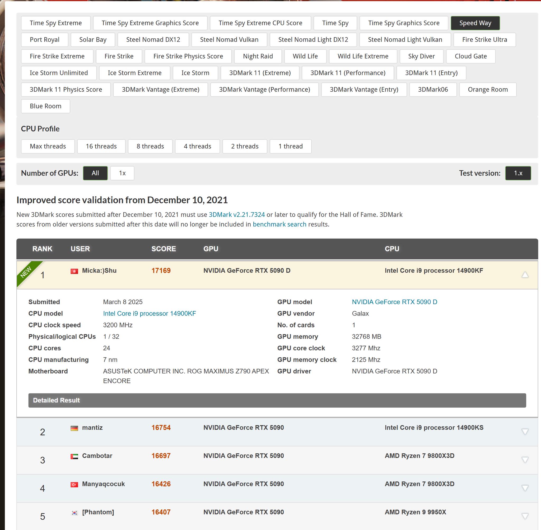 Les overclockeurs ont atteint 17 169 points dans le benchmark 3DMark Speed Way, avec une fréquence maximale de la carte graphique de 3277 MHz pour établir un nouveau pallier.