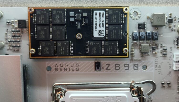 Visuellement, la Z890 AORUS Tachyon ICE CAMM2 ressemble à l’ancienne version mais avec des améliorations notables. Le socket est désormais orienté à 90 degrés, tandis que les modules de mémoire sont repositionnés sur le dessus de la carte. Un connecteur CAMM2 remplace les emplacements UDIMM de la précédente version.