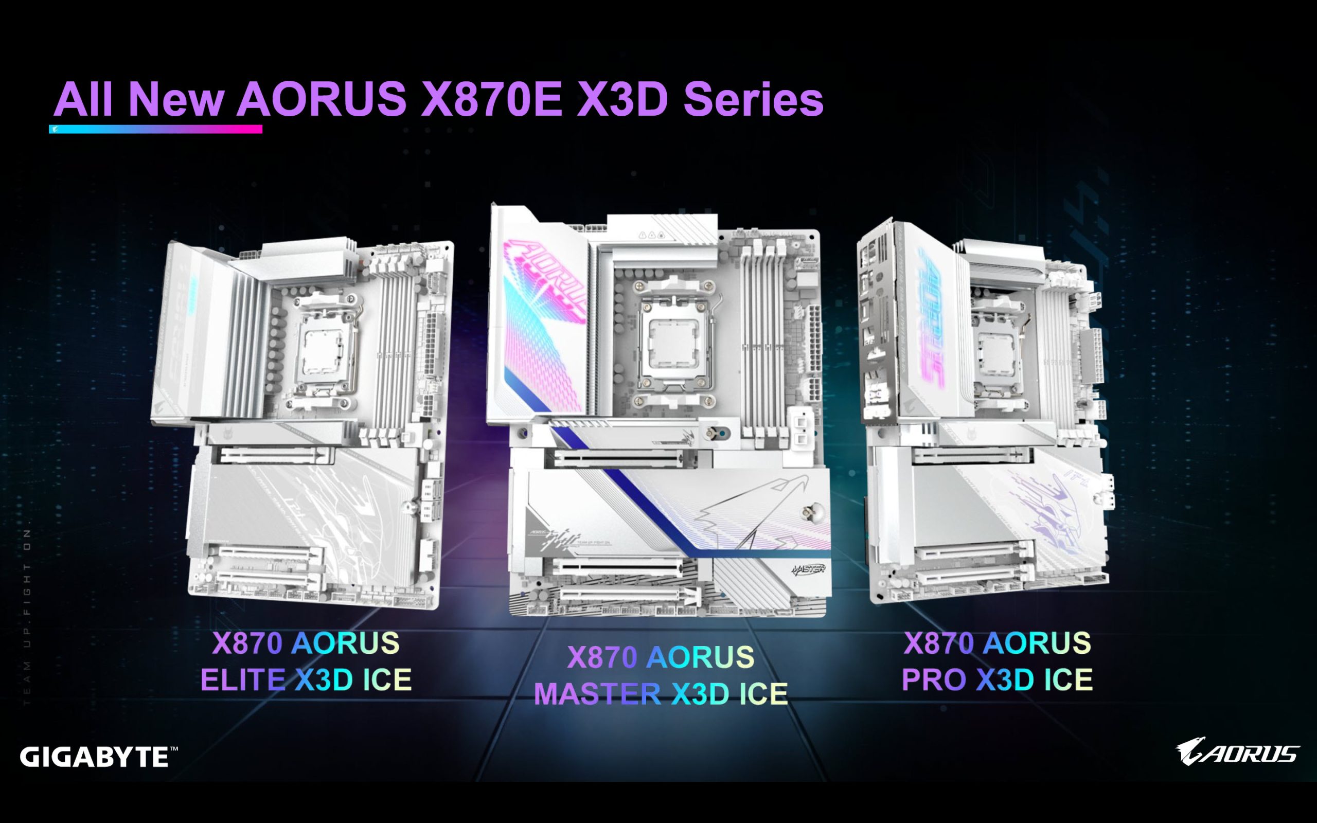 Concernant le trio de nouvelles cartes mères, on trouve les modèles Gigabyte X870 AORUS Master X3D ICE, X870 AORUS PRO X3D ICE et X870 AORUS ELITE X3D ICE.