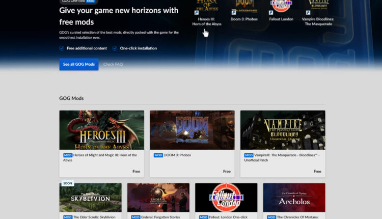 Se positionnant comme un concurrent du Steam Workshop de Valve, GOG déploie cette fonction de façon limitée pour l’instant. La page de mods en un clic met en avant quelques projets bien connus, comme Horn of the Abyss pour Heroes of Might and Magic III, Phobos pour Doom 3, et le correctif non officiel pour Vampire: The Masquerade – Bloodlines. GOG annonce également que Skyblivion arrive bientôt.