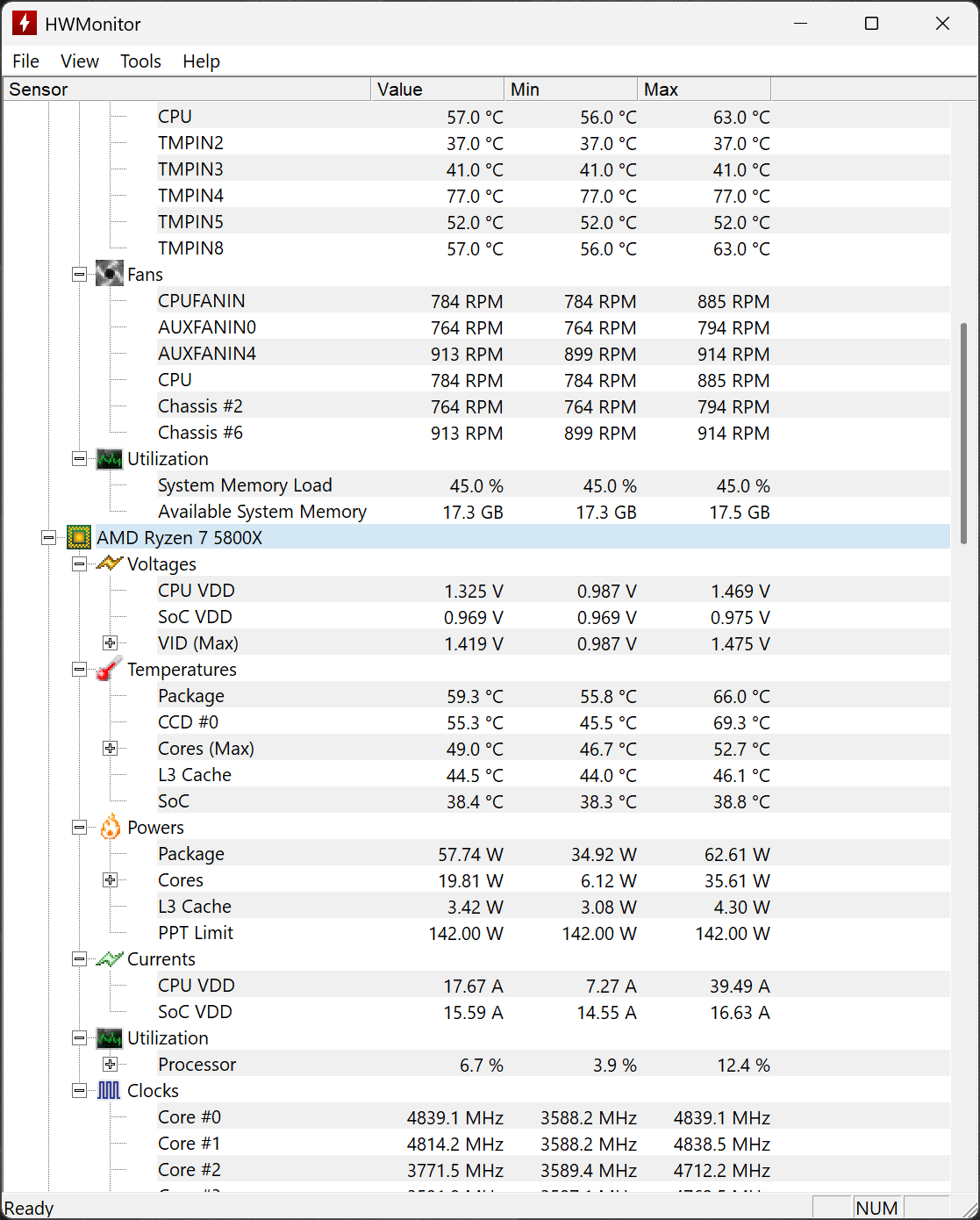 HWMonitor liste les températures des cœurs individuellement (Cœur 0, Cœur 1, etc.) et montre également une température globale du package CPU. Les lectures des cœurs proviennent des capteurs thermiques situés à l’intérieur de chaque cœur de CPU, tandis que la température du package représente la partie la plus chaude du die du CPU. Lors de la surveillance des problèmes thermiques ou des tests de stress, la valeur la plus élevée parmi celles-ci est la plus significative.