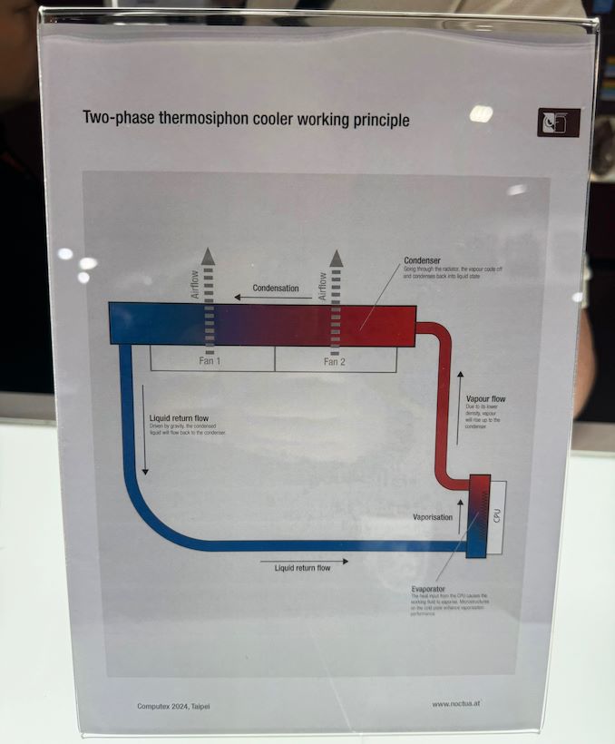 En m’adressant à Noctua lors du Computex 2024, ils m’ont informé des avantages et des inconvénients de la technologie Thermosiphon. En termes d’avantages, le refroidissement Thermosiphon en lui-même n’a pas d’éléments mobiles, ce qui améliore non seulement la fiabilité mais indique également qu’il y a moins de risques de dysfonctionnement. Un autre point positif est que même les refroidisseurs de CPU AIO les plus silencieux peuvent être assez bruyants, car la pompe à eau qui fait circuler le liquide peut causer des vibrations, ce qui génère du bruit. Le plus grand inconvénient de la mise en œuvre du refroidissement Thermosiphon pour les PC est que les tubes conventionnels peuvent s’user avec le temps. Bien que l’ajout de tubes métalliques durerait plus longtemps, ils ne sont pas flexibles, bien que Noctua ait évoqué qu’ils en ont discuté avec les intégrateurs de systèmes.