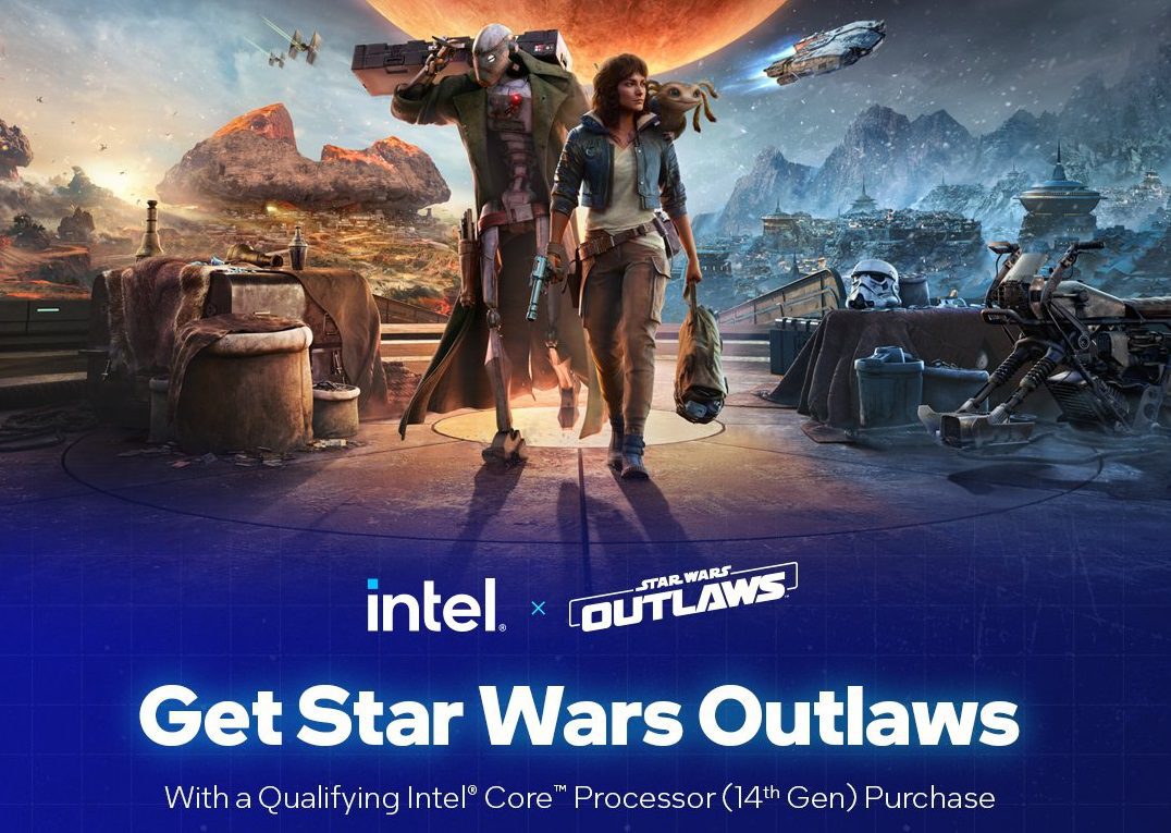 Jusqu’au 31 juillet, Intel offrira des copies PC gratuites de Star Wars Outlaws avec certains processeurs Intel de 14e génération chez les sites de ventes participants. Cette offre permettra aux acheteurs d’Intel d’obtenir une copie gratuite du prochain grand jeu d’Ubisoft, même avec des processeurs d’entrée de gamme tels que l’i5-14400F. Cette offre s’applique aux processeurs, aux PC complets et aux portables équipés des processeurs admissibles.