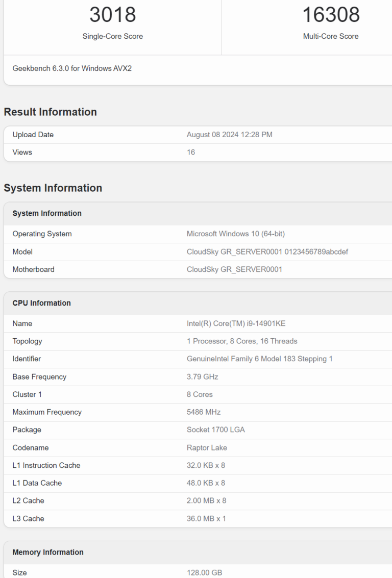 Le PC équipé du processeur Intel Core i9-14901E est identifié comme un CloudSky Server. CloudSky semble être une société offrant des serveurs GPU pour les joueurs, avec des services probablement liés à l’hébergement de jeux comme Minecraft. Le système dispose apparemment de 128 Go de RAM.