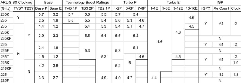 Le SKU phare, Core Ultra 9 285K, devrait comporter 8 cœurs Lion Cove (Performance) et 16 cœurs Skymont (Efficient). C’est la configuration la plus puissante de la gamme, qui peut atteindre 5.7 GHz grâce à la technologie Thermal Velocity Boost, comme précédemment indiqué. Ces caractéristiques concernent la déclinaison à TDP de 125W, mais le SKU sera également disponible en versions 65W (285 non-K) et même 35W TDP (285T). Pour ces SKU, la fréquence de base sera considérablement plus basse : 2.5 GHz et 1.4 GHz, respectivement, comparé aux 3.7 GHz P-Cores du 285K.