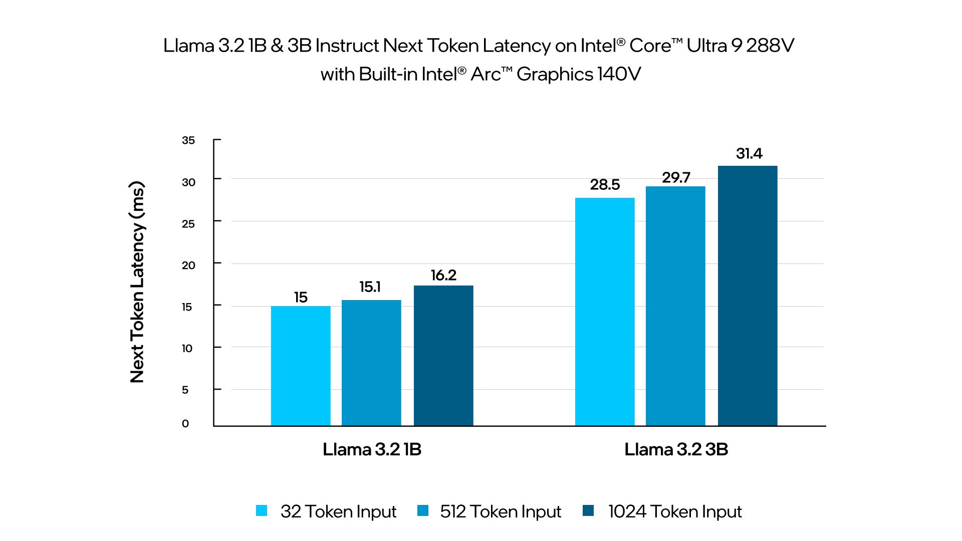 Selon les informations communiquées par Intel, le CPU phare Intel Core Ultra 9 288V « Lunar Lake » affiche une latence particulièrement faible, atteignant seulement 28,5 ms pour 32 tokens d’entrée, et 31,4 ms pour 1024 tokens avec le modèle 3B. Ces performances garantissent une fluidité remarquable pour les applications d’inférence AI.
