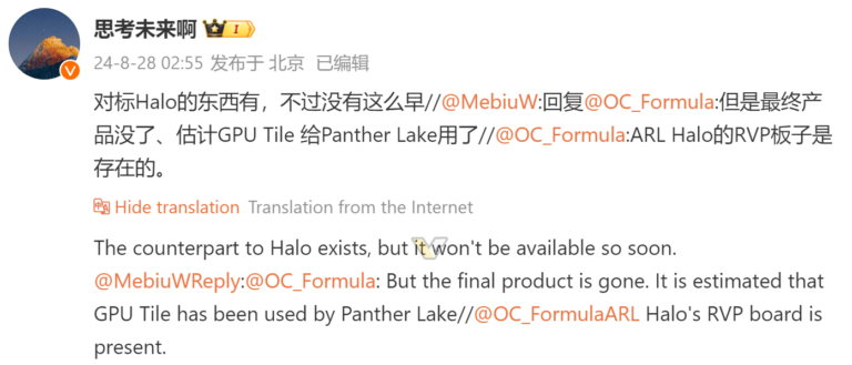 D’après 思考未来啊, un responsable produit chez Lenovo, l’Intel Arrow Lake Halo ne serait pas qu’une simple rumeur ; il est en effet toujours prévu, mais cela pourrait ne pas correspondre au produit mentionné dans les documents fuités. Intel travaille apparemment sur un produit de niveau Strix Halo, mais son lancement ne se fera pas dans un futur proche. Aucun détail supplémentaire n’a été communiqué.
