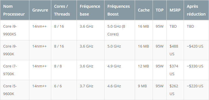 Les réductions de prix devraient entrer en vigueur juste à temps pour le prochain lancement de la série Ryzen 3000 d’AMD dans un peu moins de trois semaines. Ses Core i9-9900K, i7-9700K et i5-9600K, verront leurs prix baisser jusqu’à 75 $ indique Digitimes via TechPowerUp.