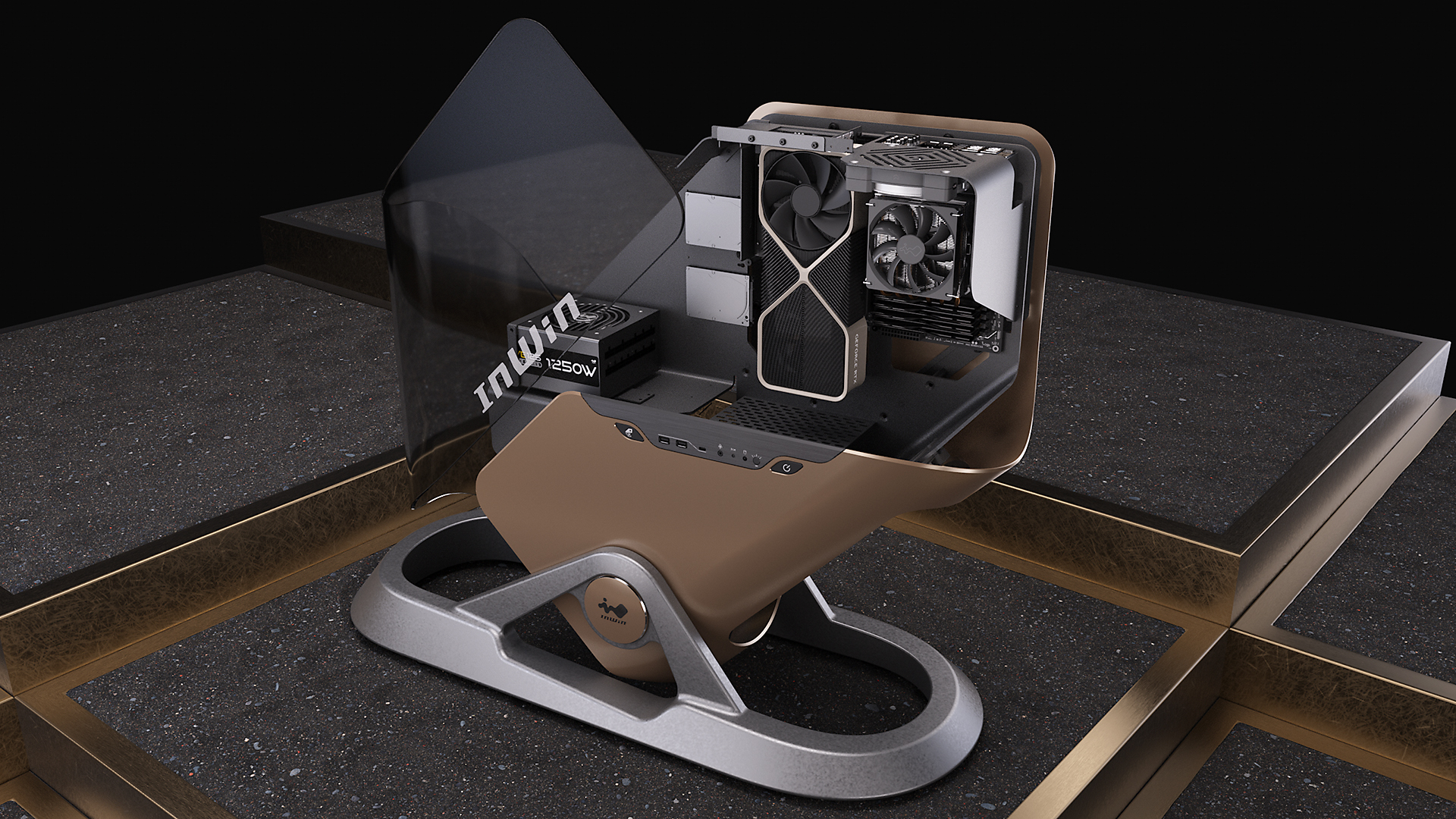 Présenté pour la première fois au Computex plus tôt cette année, l’Infinite est un exemple flagrant de la philosophie d’InWin. Ce qui attire immédiatement l’attention est le panneau en verre courbé, qui enveloppe le boîtier sous forme d’arc. Le verre, d’une épaisseur de 6 mm, est renforcé chimiquement pour offrir une durabilité accrue. De plus, il est recouvert d’une couche protectrice pour résister aux rayures et aux dommages.
