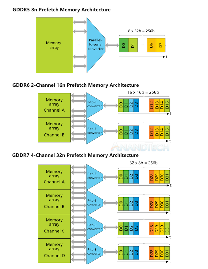 En examinant plus en détail les caractéristiques, JEDEC a à nouveau subdivisé une seule puce mémoire GDDR de 32 bits en un plus grand nombre de canaux. Alors que le GDDR6 offrait deux canaux de 16 bits, le GDDR7 élargit cela à quatre canaux de 8 bits. Cette distinction est quelque peu arbitraire du point de vue de l’utilisateur final – il s’agit toujours d’une puce de 32 bits fonctionnant à 32 Gbps/broche, quelle que soit sa configuration – mais elle a un impact considérable sur le fonctionnement interne de la puce. En particulier, JEDEC a conservé la taille d’anticipation de 256 bits par canal du GDDR5 et du GDDR6, ce qui fait du GDDR7 une conception d’anticipation de 32n.
