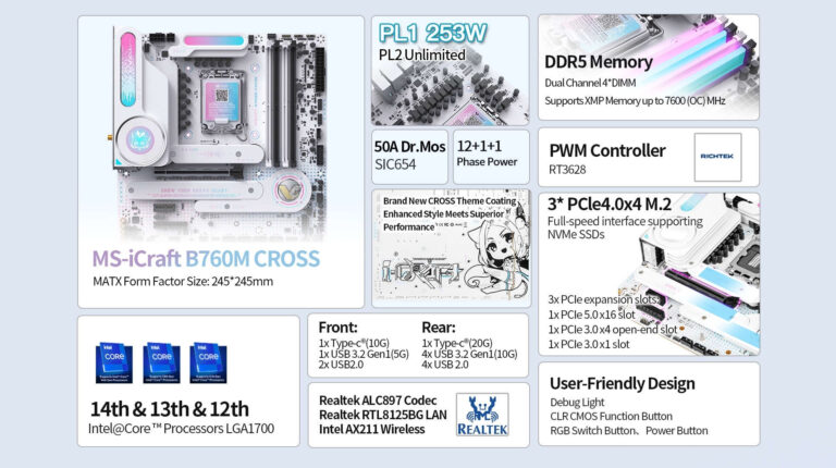 Le nouveau motherboard iCraft B760M est lancé à 149 $. Conçu par le constructeur chinois Maxsun, ce modèle Micro-ATX offre un design unique en blanc avec des motifs violets et bleus. Malgré son prix abordable, le Cross supporte la mémoire DDR5 et dispose de plusieurs emplacements PCIe. Il est compatible avec les CPU Intel de 12e, 13e et 14e génération pour le socket LGA1700. Son prix est de 149 $.