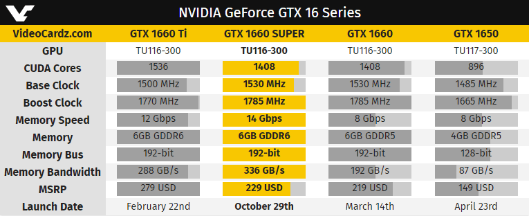 La NVIDIA GeForce GTX 1660 SUPER sera lancée le 29 octobre à 229 dollars US. C’est 10 de plus que les non-SUPER, mais aussi 50$ de moins que la variante Ti.