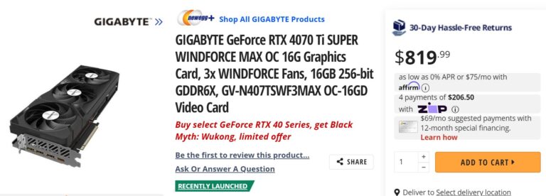 Jusqu’à présent, seul le modèle SUPER SOLID OC a été répertorié sur Newegg au prix de 869,99 $. Cela représente 70 $ de plus que le PDSF officiel pour le RTX 4070 Ti SUPER et, franchement, ce n’est pas une bonne affaire compte tenu du fait que certains modèles personnalisés basés sur ce SKU sont déjà disponibles pour moins cher. Le modèle Windforce MAX de Gigabyte est répertorié à 819,99 $, ce qui est un peu mieux au niveau du prix, mais toujours au-dessus du PDSF.